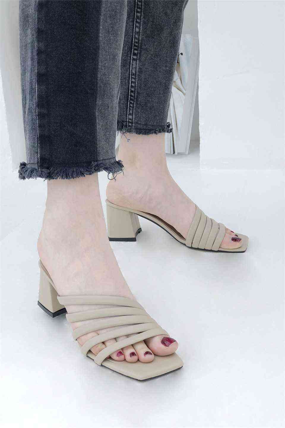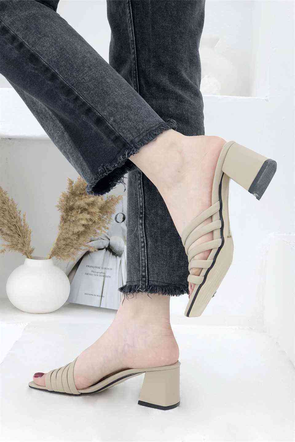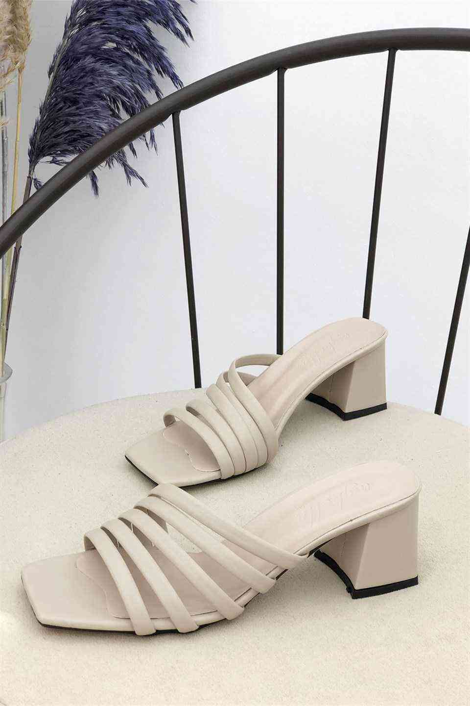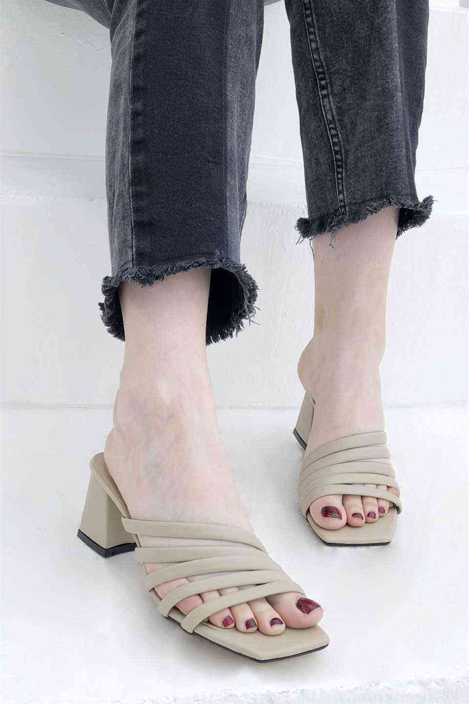 5 Bant Topuklu Kadın Terlik - Vizon