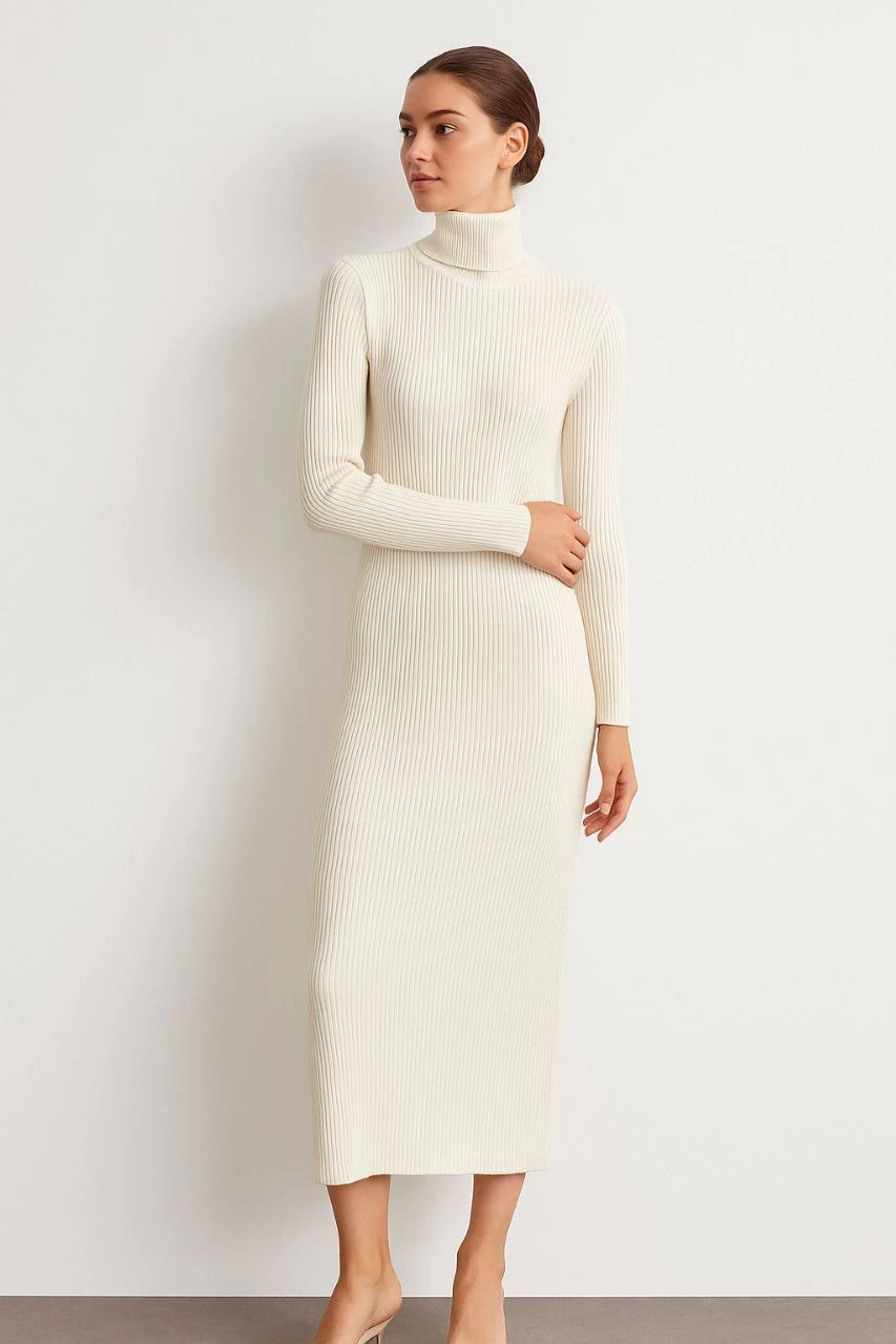 Premium Boğazlı Uzun Fitilli Triko Dokuma Elbise - Beyaz