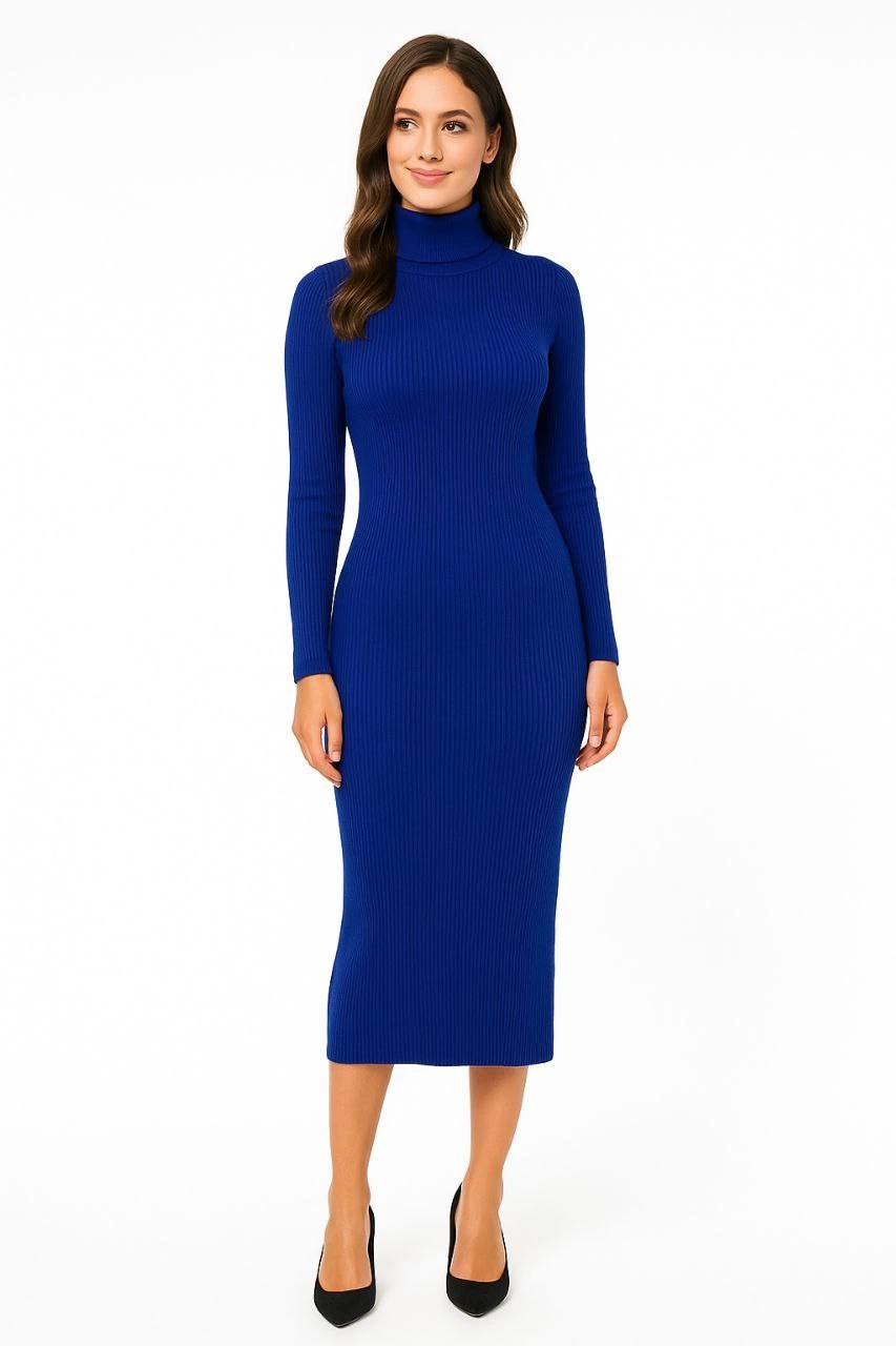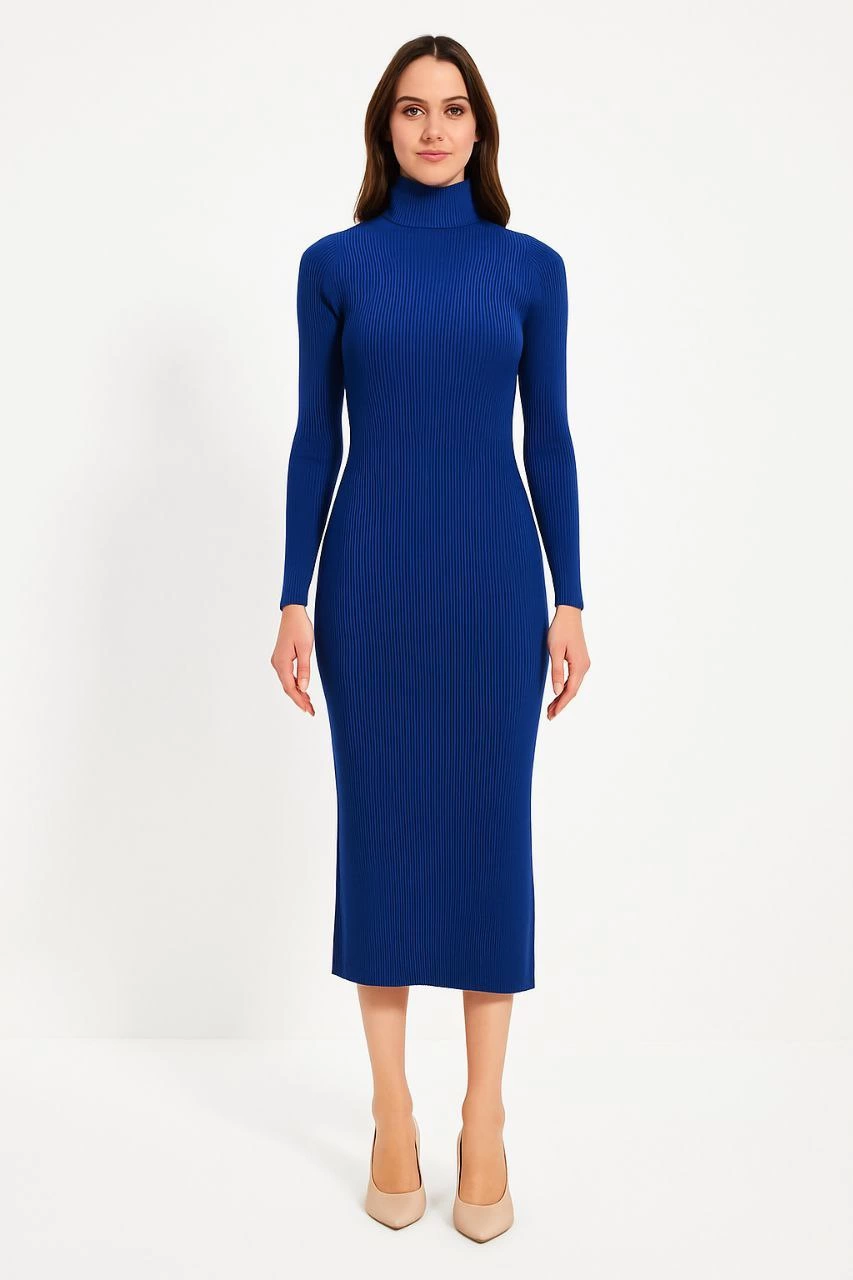 Boğazlı Triko Kadın Elbise – - Saks Mavisi -