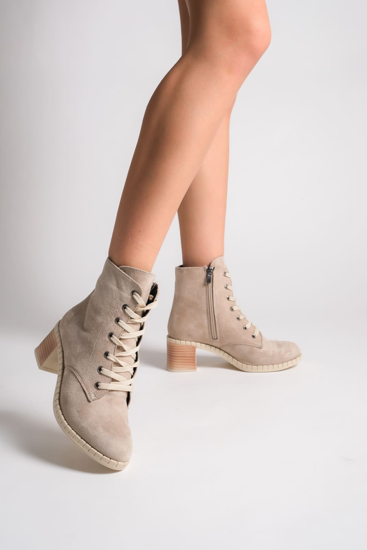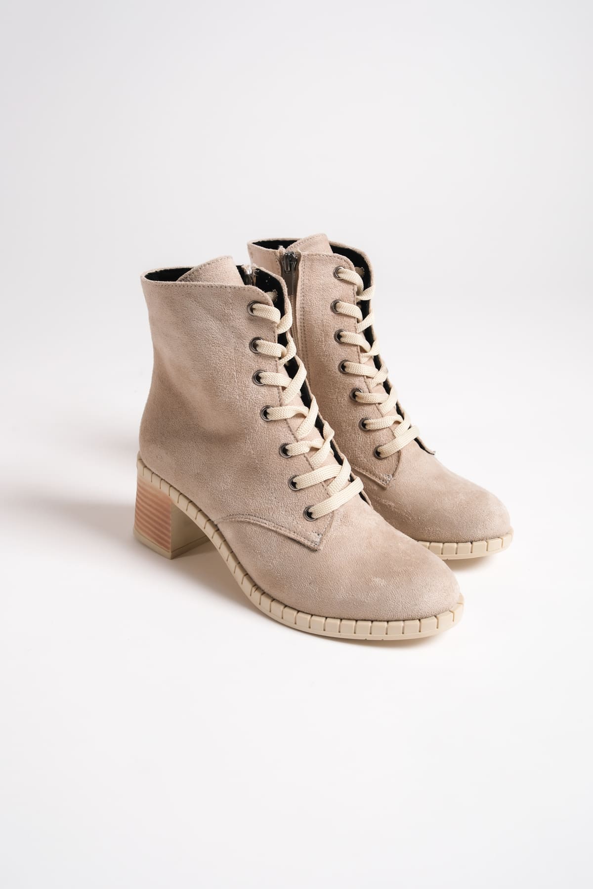 DİANA Bağcıklı Fermuarlı Ortopedik Taban Suya ve Soğuğa Dayanıklı Topuklu Süet Kadın Bot TT Ten