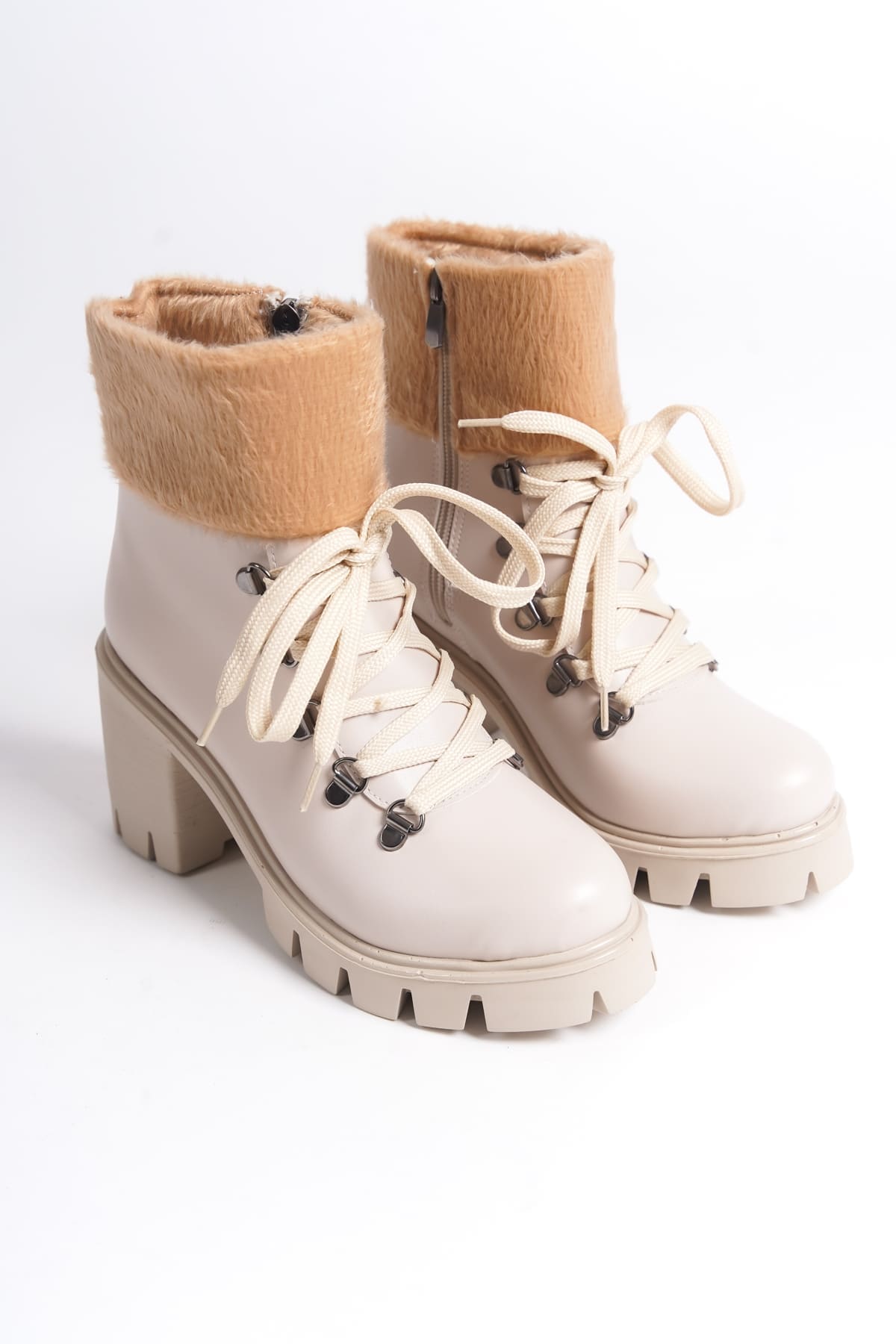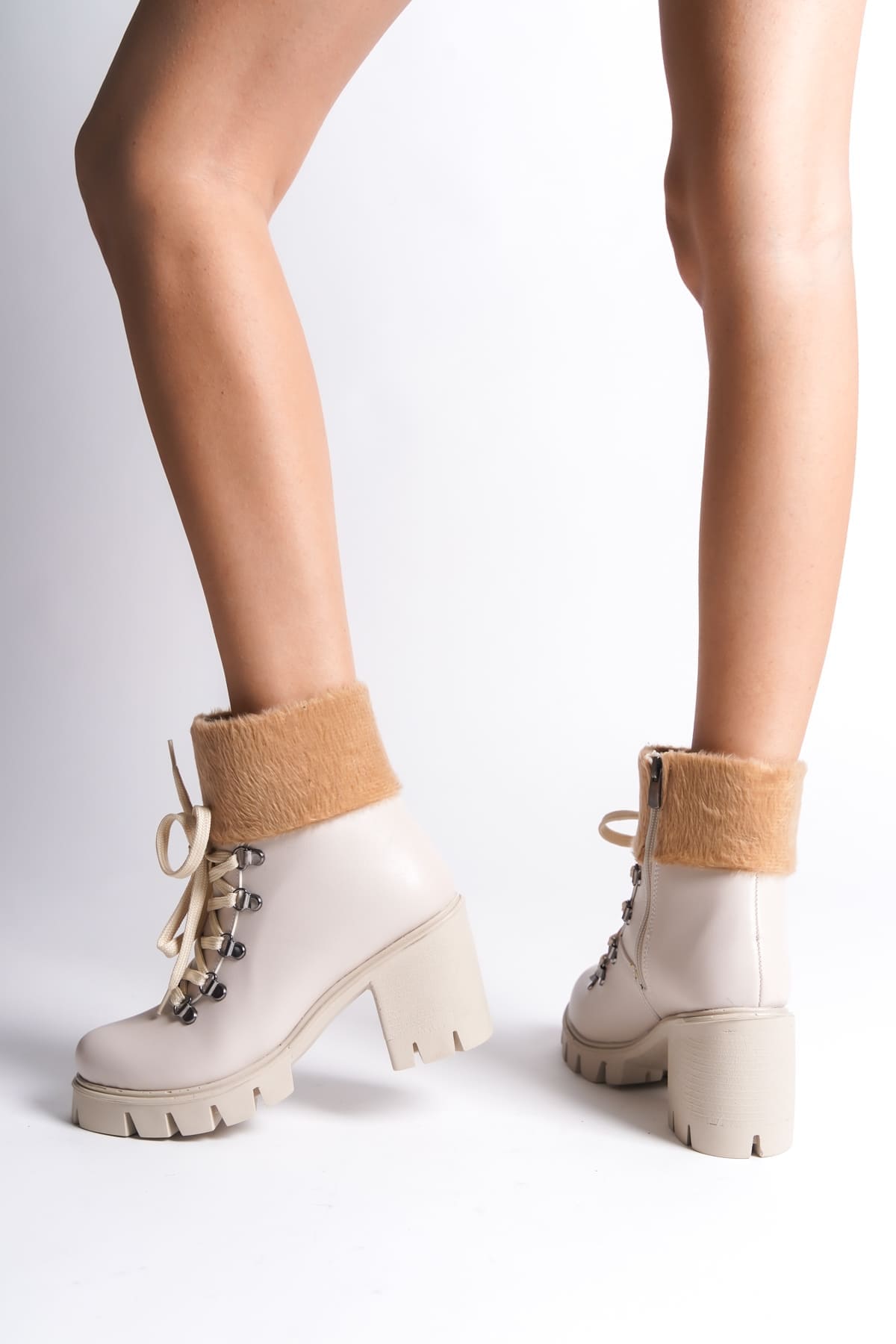 EMMA Bağcıklı Fermuarlı Ortopedik Taban Topuklu Kürk Detaylı Cilt Kadın Bot KT Krem