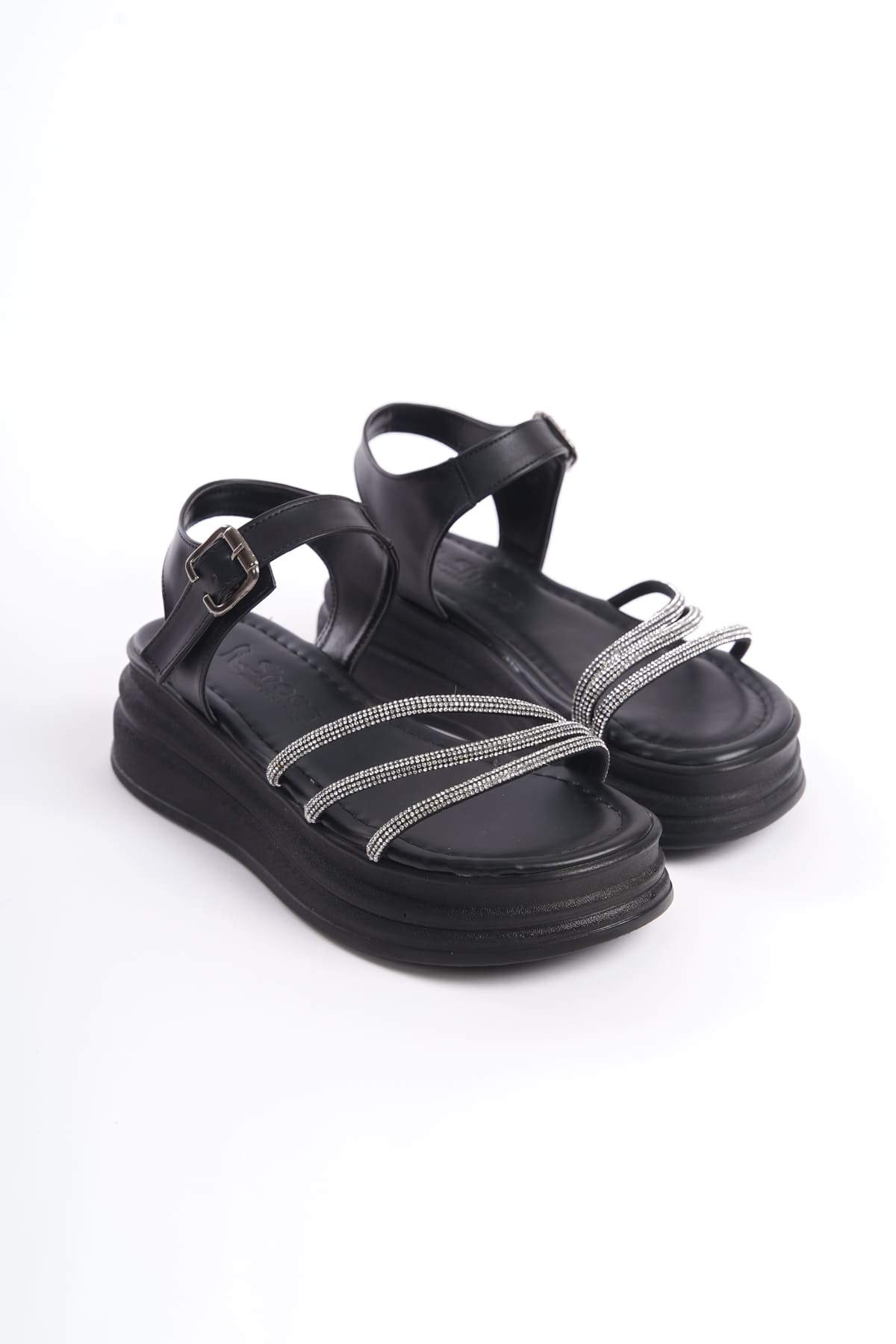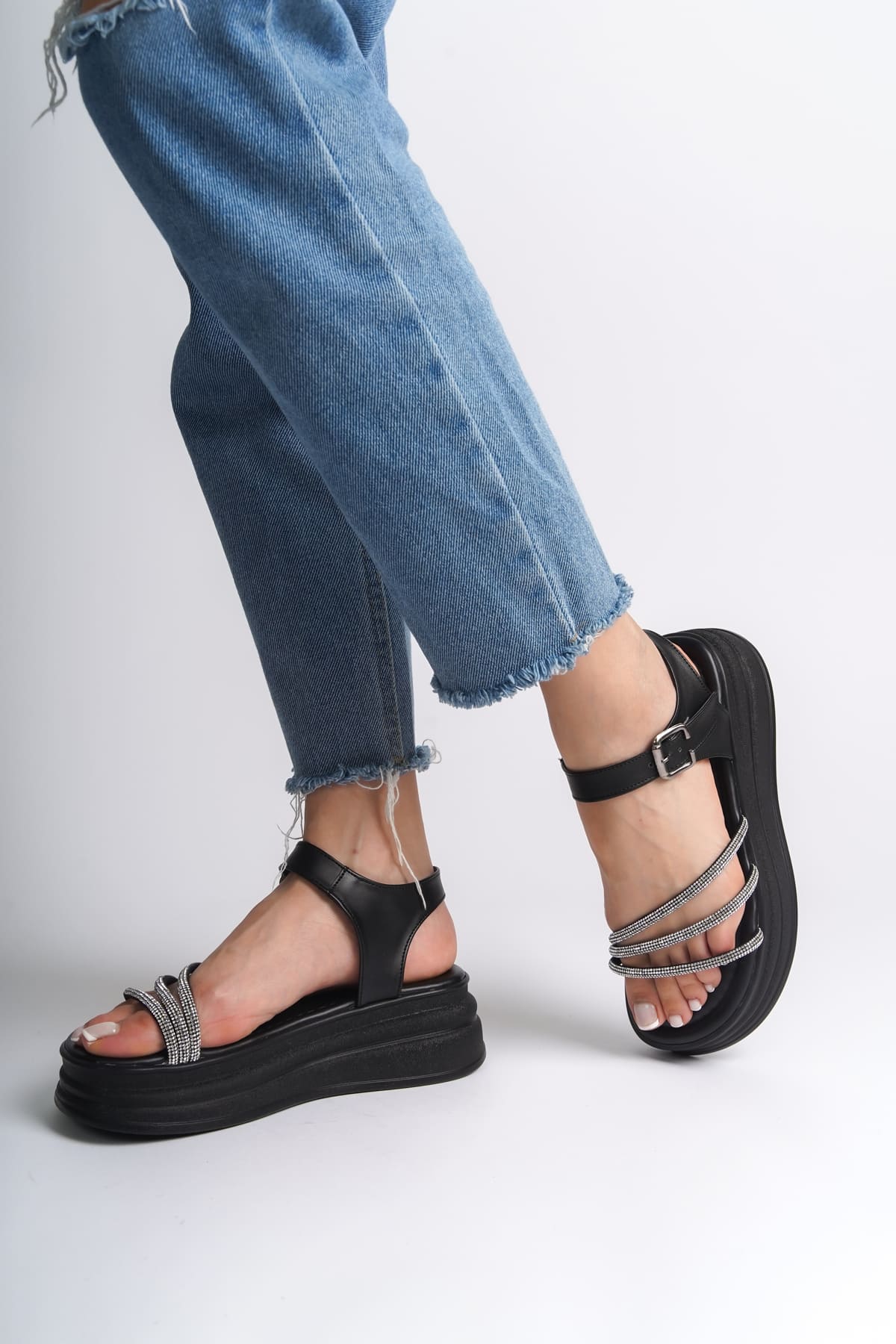 New Eva Kalın Topuklu Taşlı Siyah Kadın Sandalet