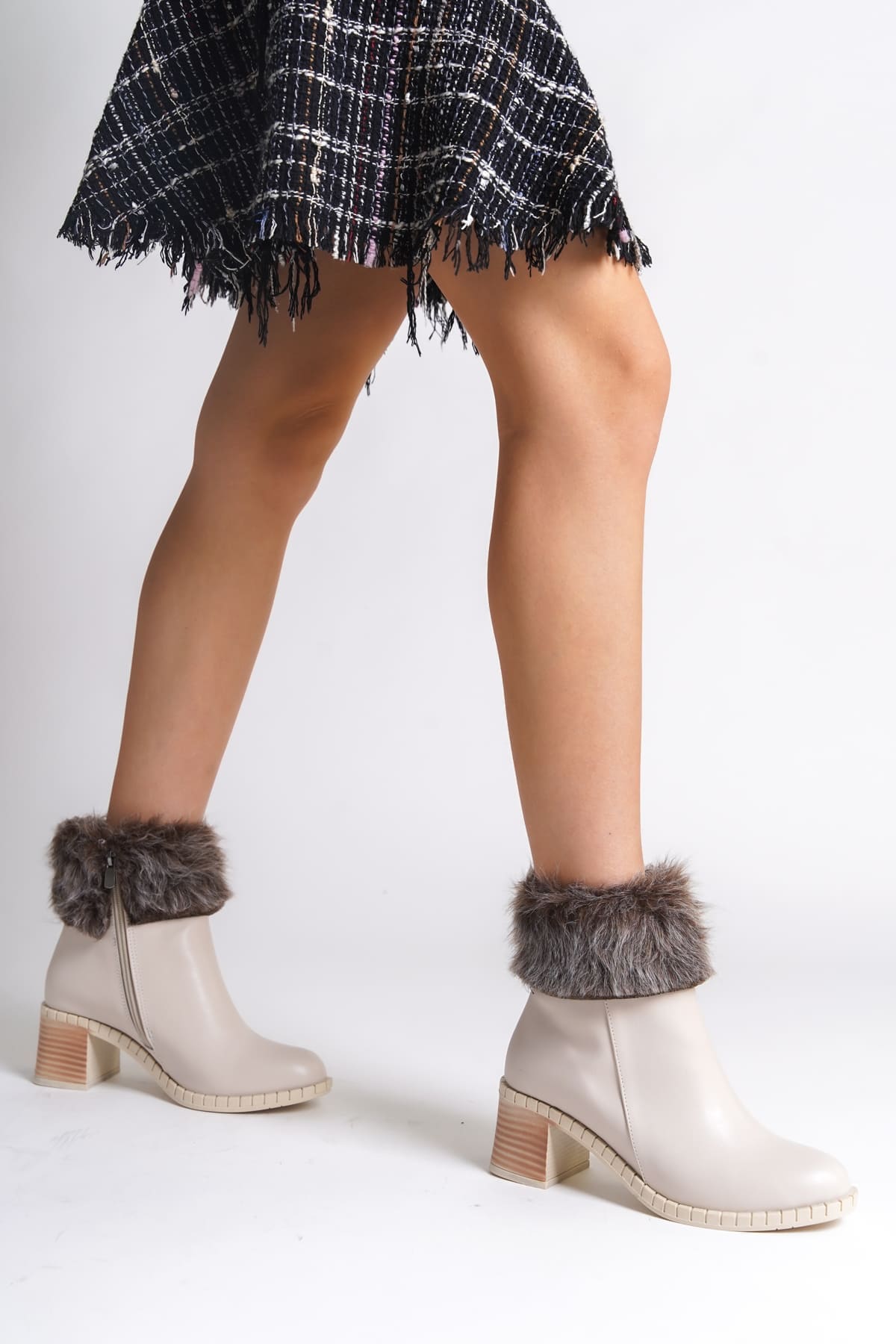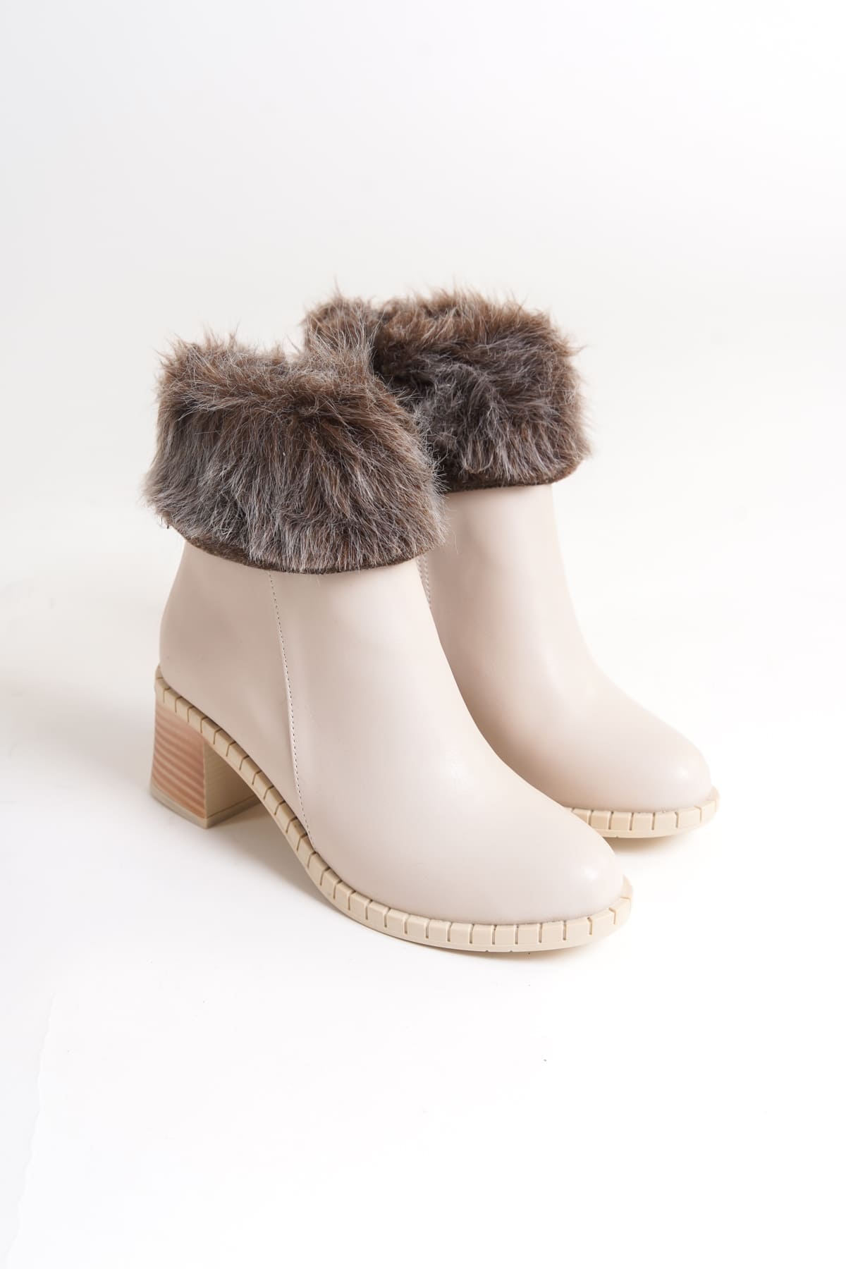 JULİA Fermuarlı Ortopedik Taban Suya ve Soğuğa Dayanıklı Tüylü Topuklu Kadın Bot KT Krem