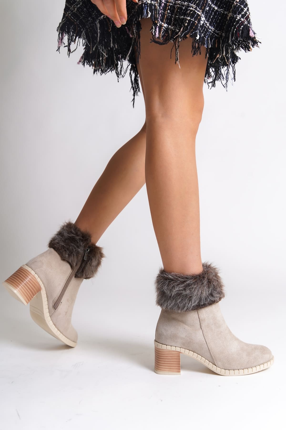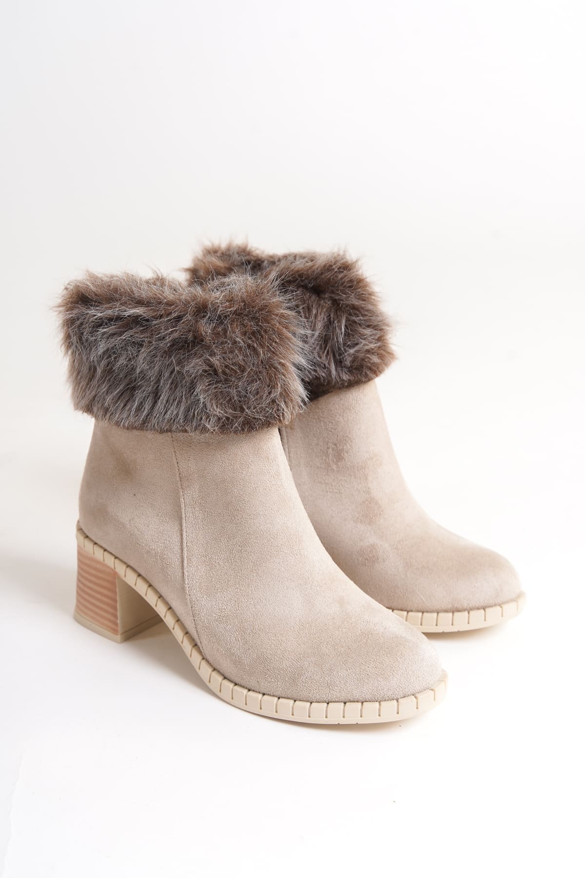 JULİA Fermuarlı Ortopedik Taban Suya ve Soğuğa Dayanıklı Tüylü Topuklu Süet Kadın Bot KT Krem