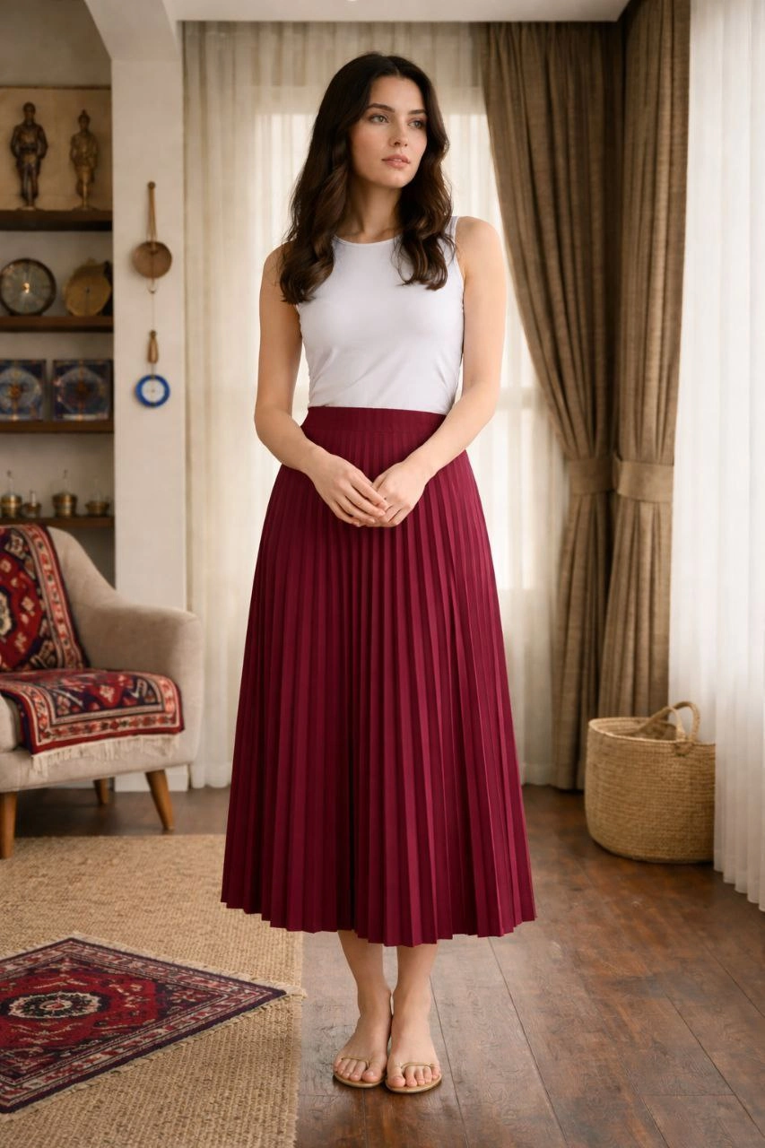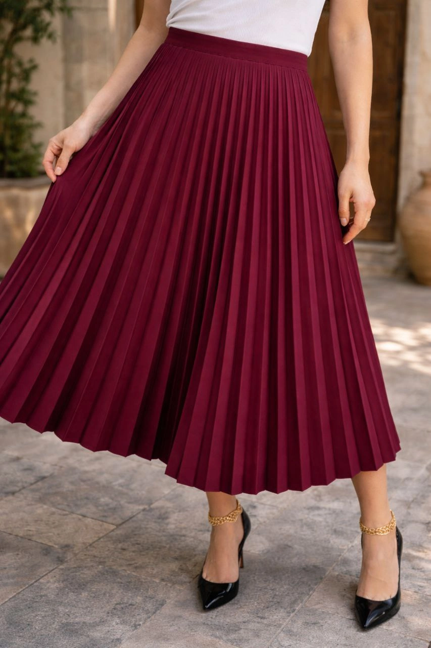 Kadın 90 Cm Saten Kumaş Pliseli Midi Etek Şık ve Zarif Tasarım - Bordo