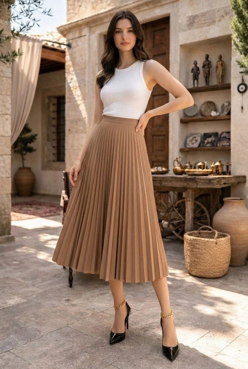 Kadın 90 Cm Saten Kumaş Pliseli Midi Etek Şık ve Zarif Tasarım - Kahverengi