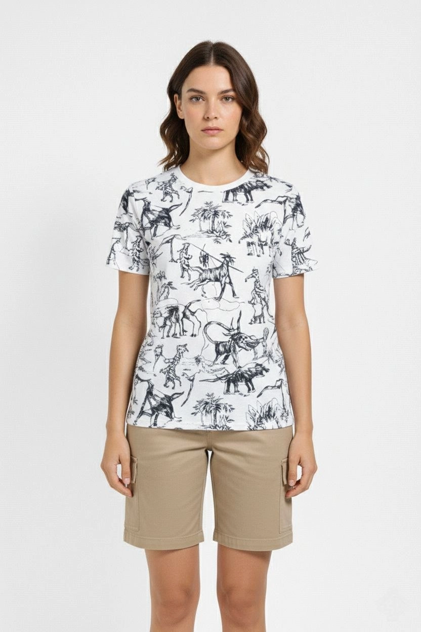 Kadın Beyaz Dinozor Desenli Tişört – Regular Kalıp, Bisiklet Yaka, Dijital Baskılı Pamuklu T-Shirt - Beyaz