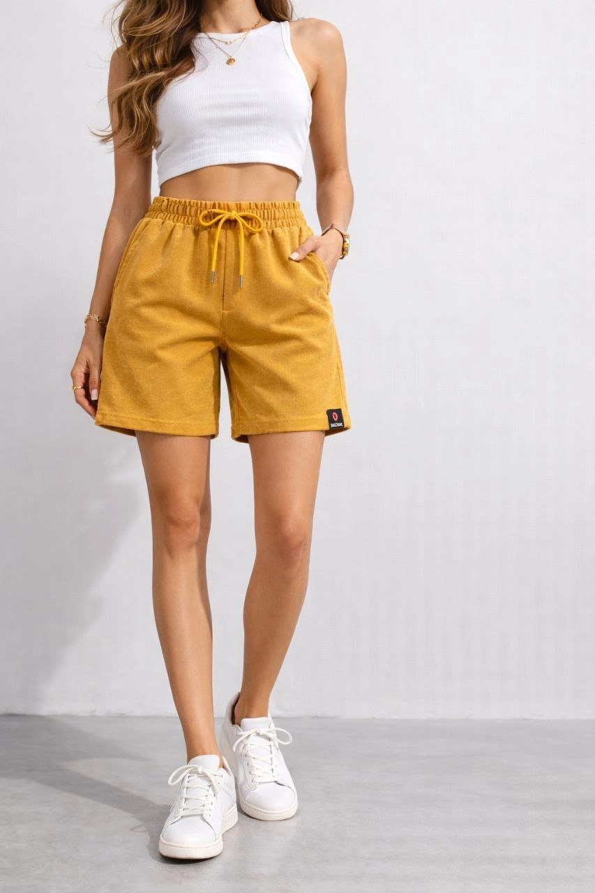 Kadın Dokuma otoban Şort Beli Lastikli Bağcıklı, Cepli, Rahat Kesim Günlük Yazlık Şort - Hardal