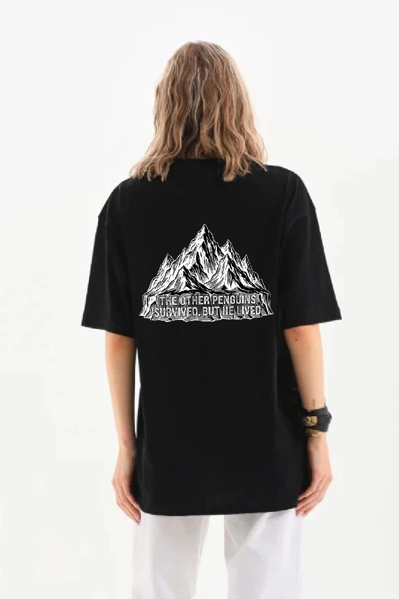 Kadın Oversize Tişört - Sırt Baskılı "Survivor Penguin" Temalı, Felsefi Yazılı Bisiklet yaka Tişört - Siyah