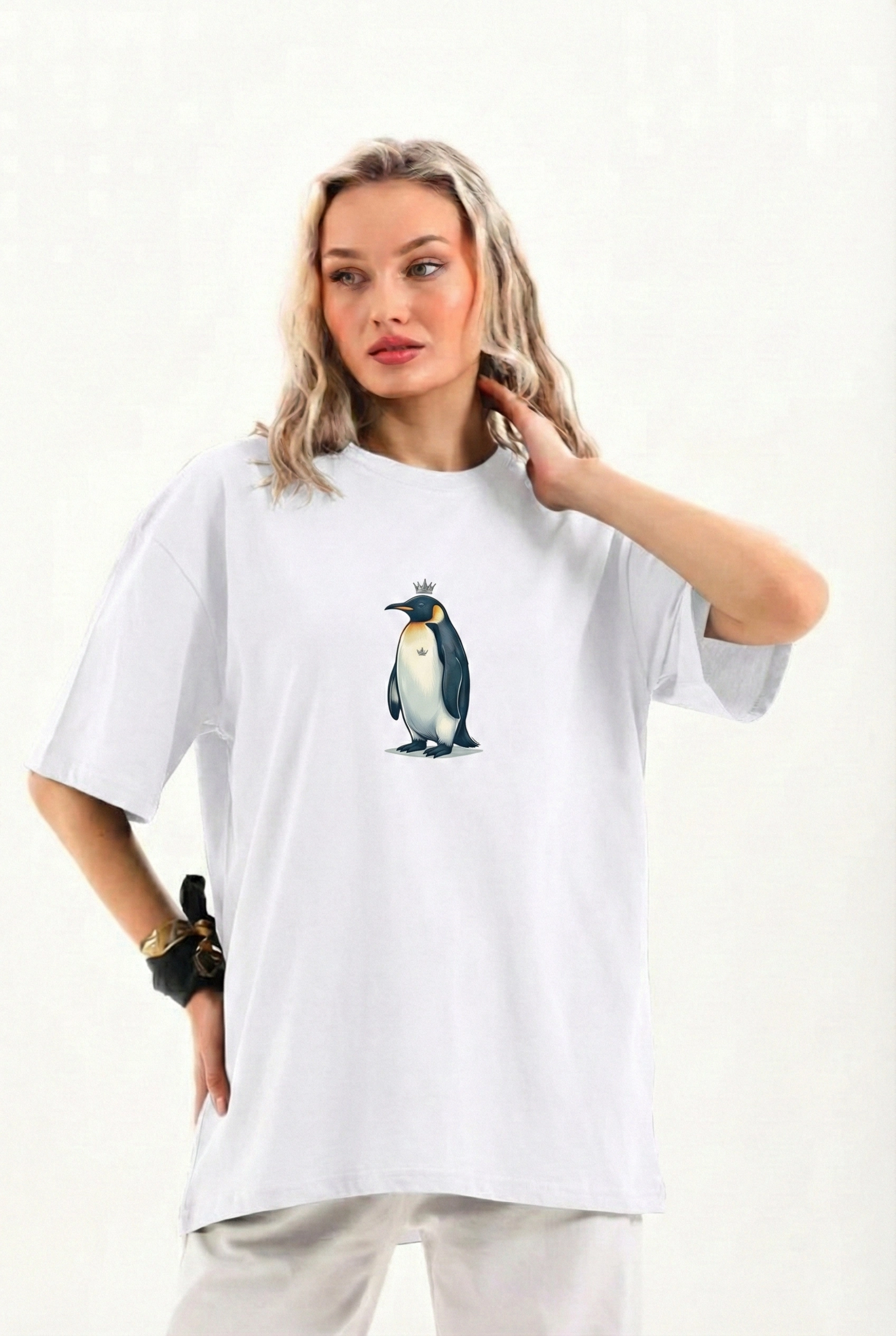 Kadın Oversize Tişört - Sırt Baskılı "Survivor Penguin" Temalı, Felsefi Yazılı Bisiklet yaka Tişört - Beyaz