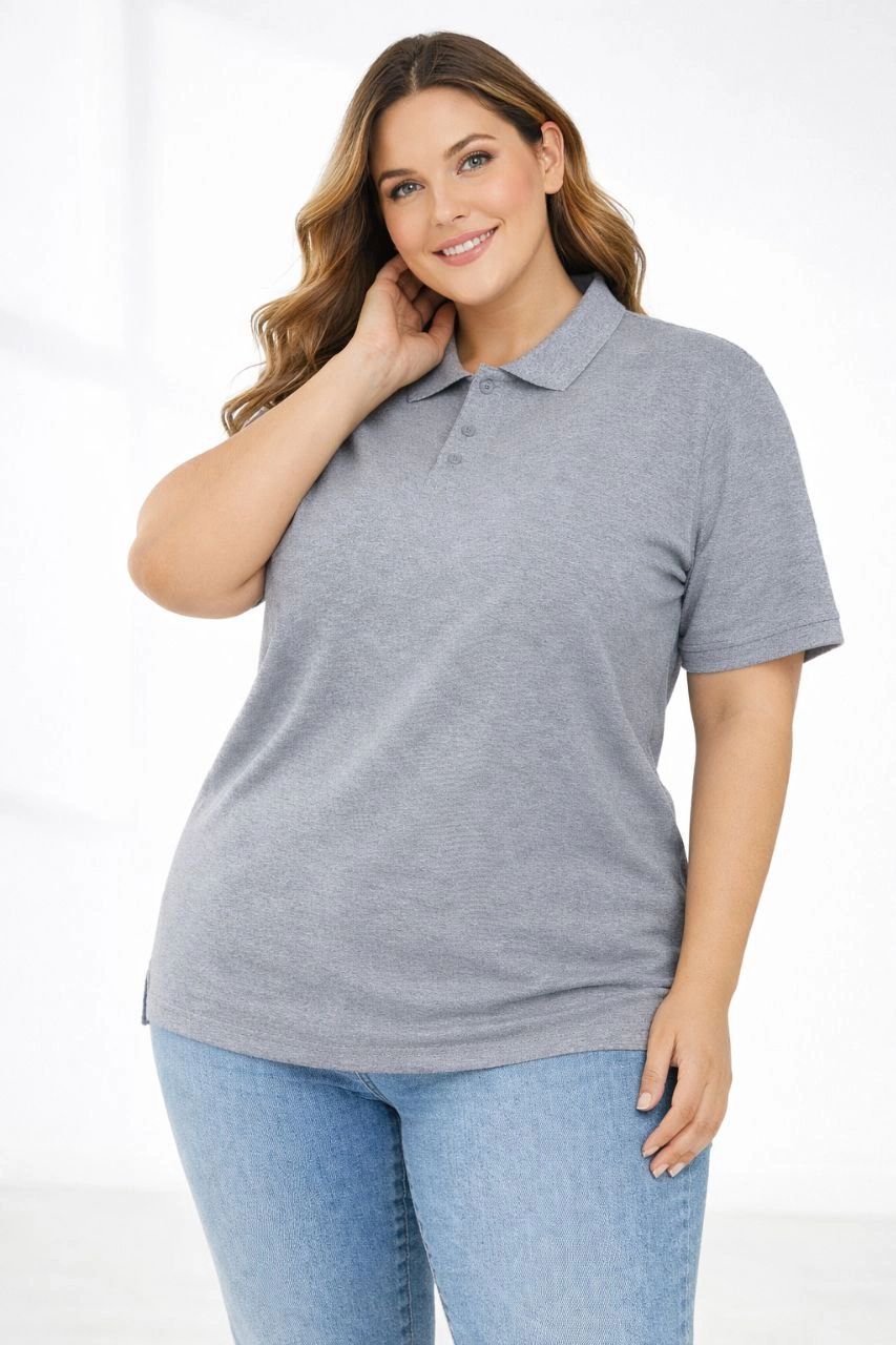 Kadın Pike Kumaş Düğmeli Yaka Battal Büyük Beden Günlük Kısa kol Tişört T-shirt - Gri