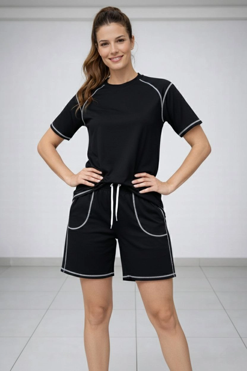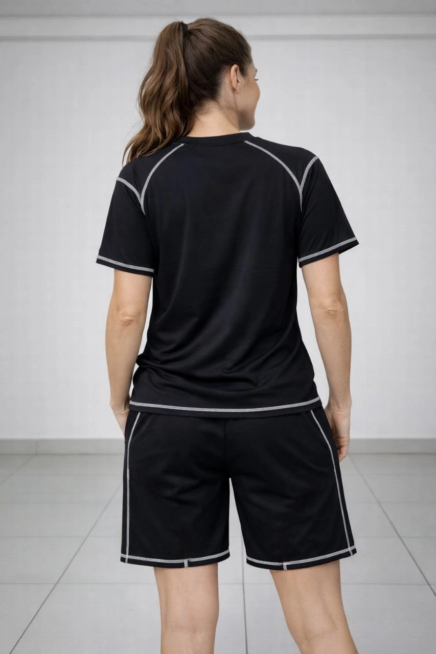 Kadın Spor Tişört Şort Takım Kontrast Dikiş Detaylı Ovarsize rahat kalıp - Siyah