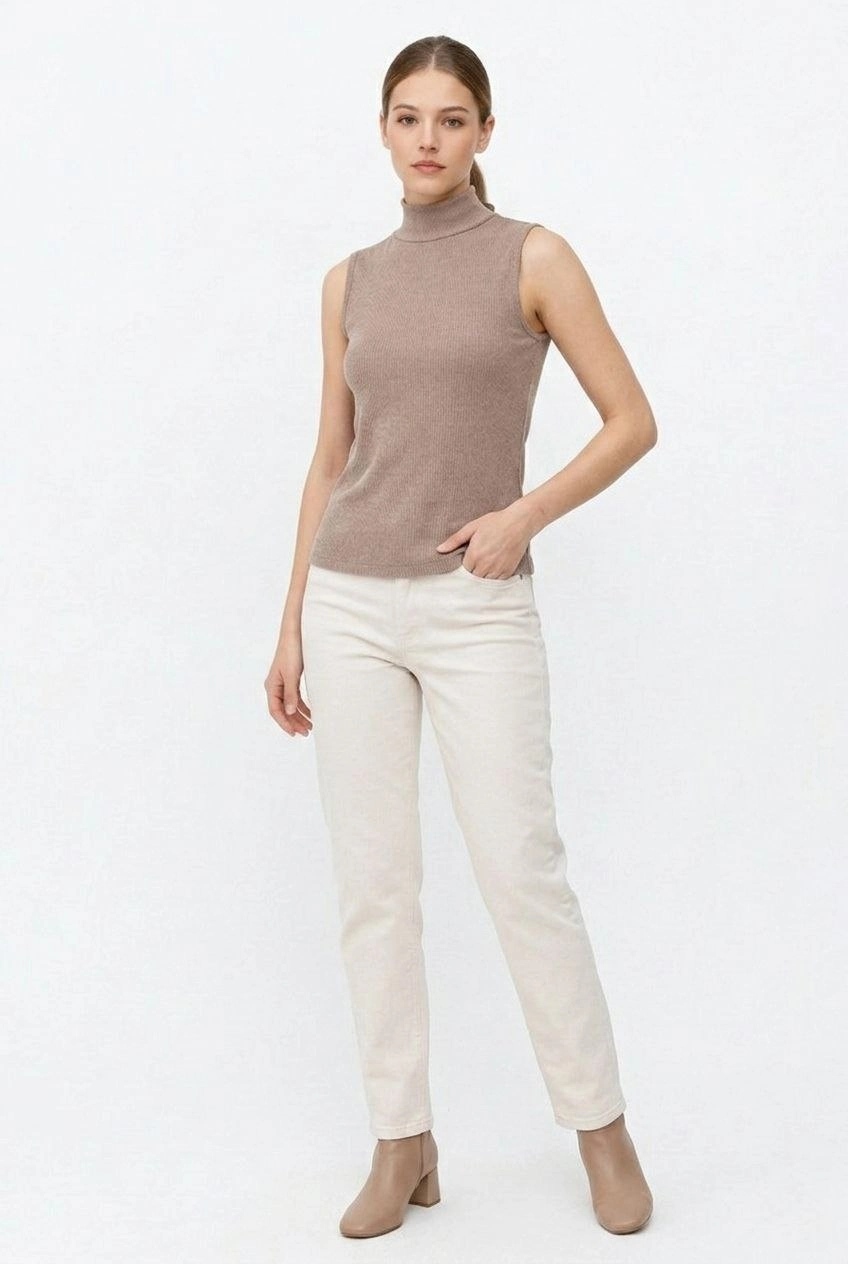 Velmora Premium Tam Boğazlı Fitilli Likrali Kaşkorse Badi İnce Uzun Kollu Kazak - Bej
