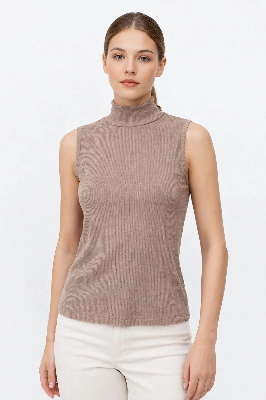 Kadın Yarım Balıkçı Yaka Fitilli Kaşkorse Atlet Basic Şık Bluz Badi - Bej