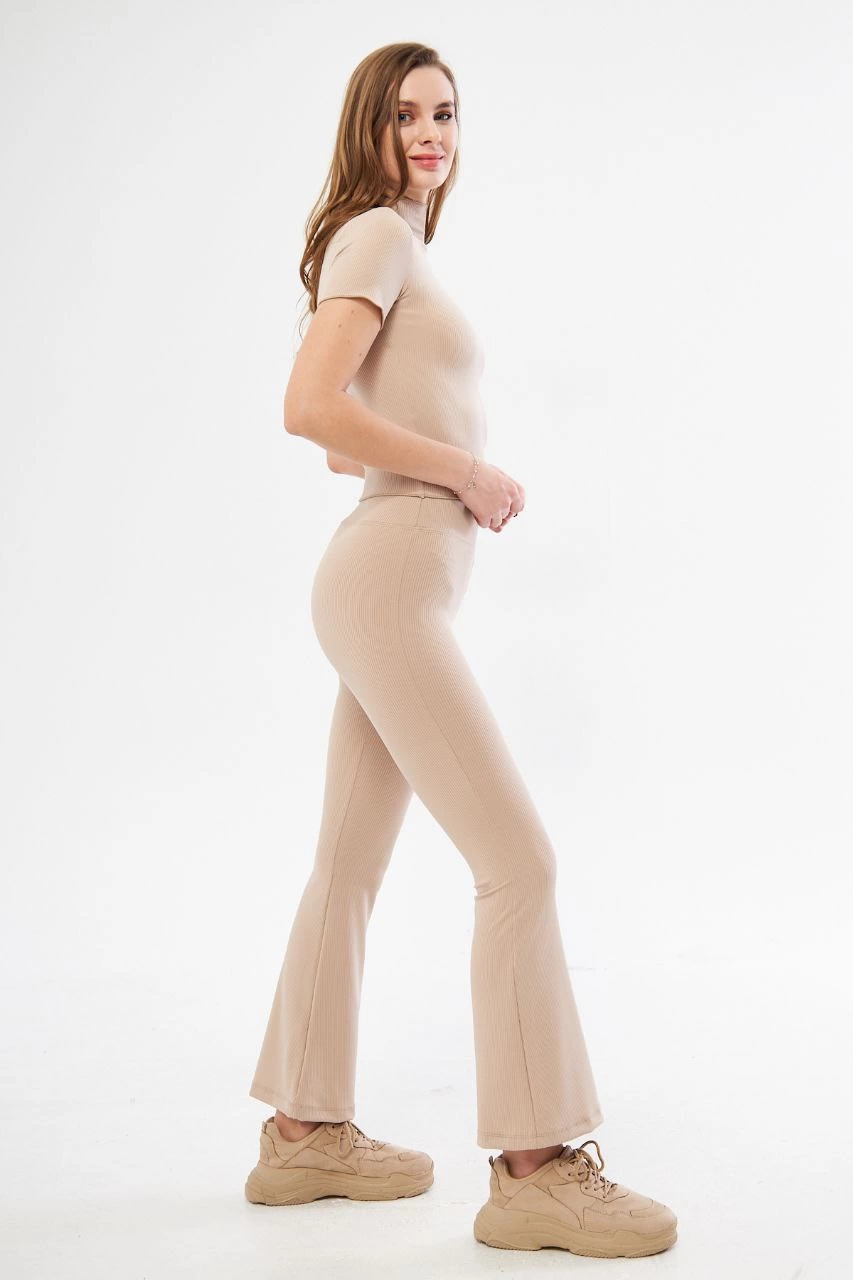 Kadın Fitilli Full Likralı Yüksek Bel Toparlayıcı Tayt Günlük ve Spor Kullanım - Bej