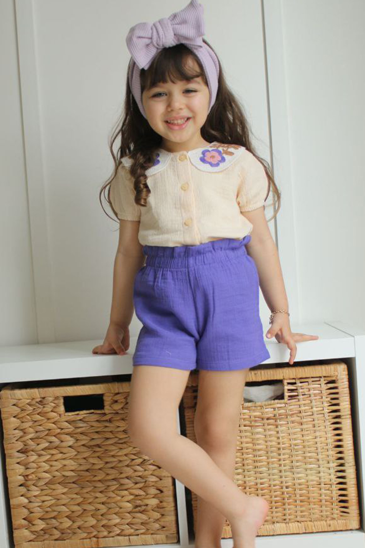 Kısa Kollu Mor Yakası Motifli Kız Çocuk Şortlu Takım