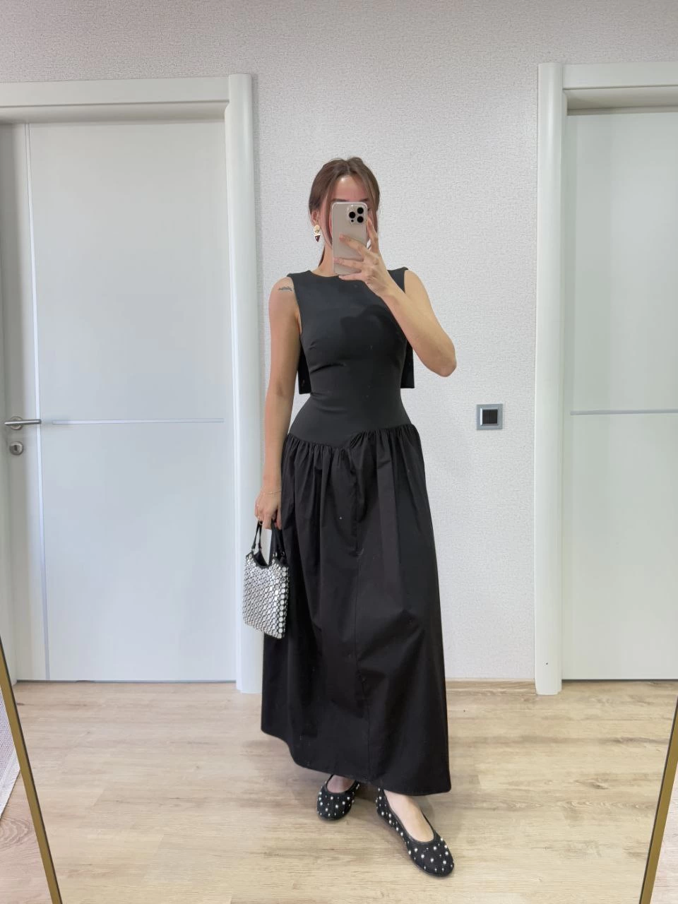 Sırt Bağlamalı Derin Yirtmaç Askılı Elbise - Siyah