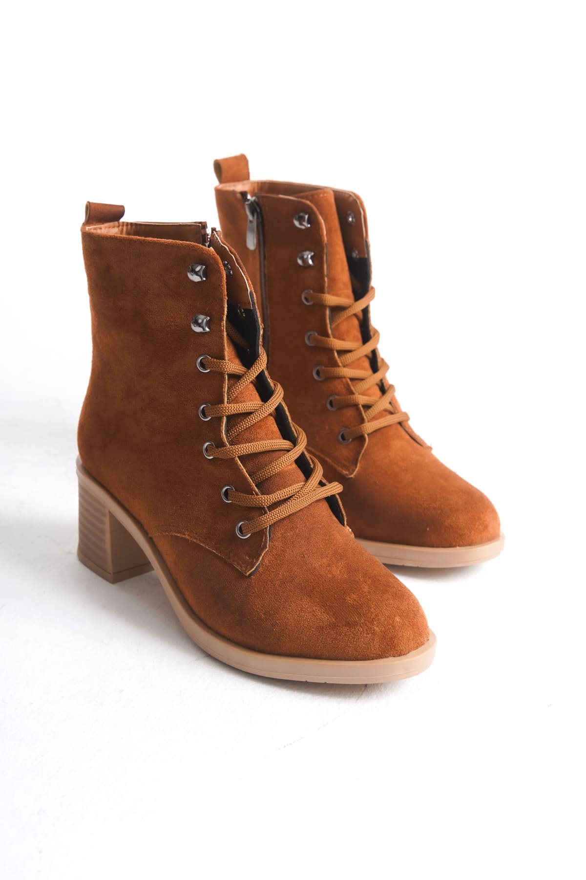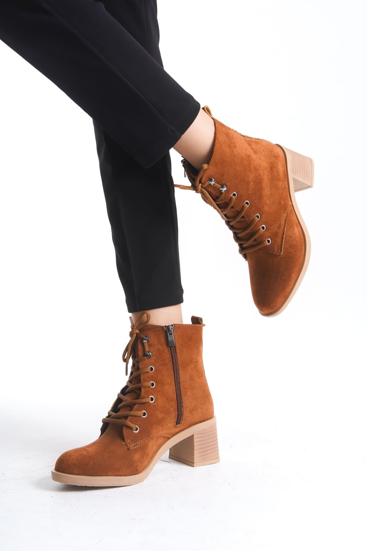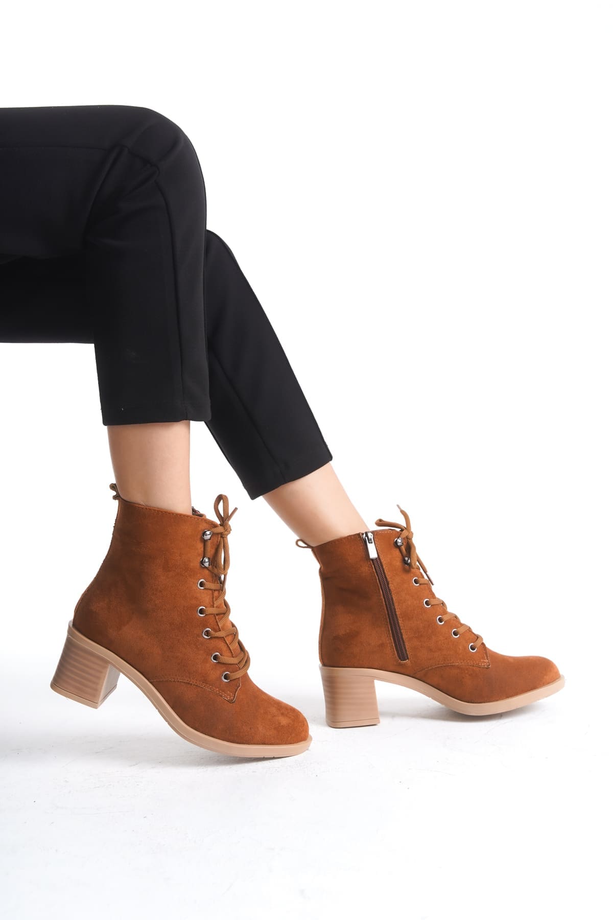 LENA Bağcıklı Fermuarlı Ortopedik Taban Suya ve Soğuğa Dayanıklı Topuklu Süet Kadın Bot TT Taba
