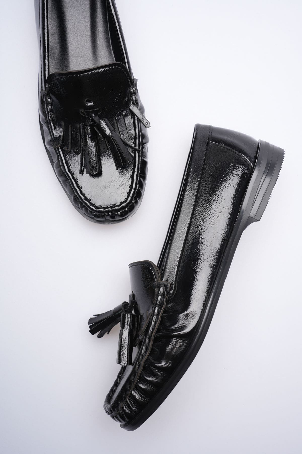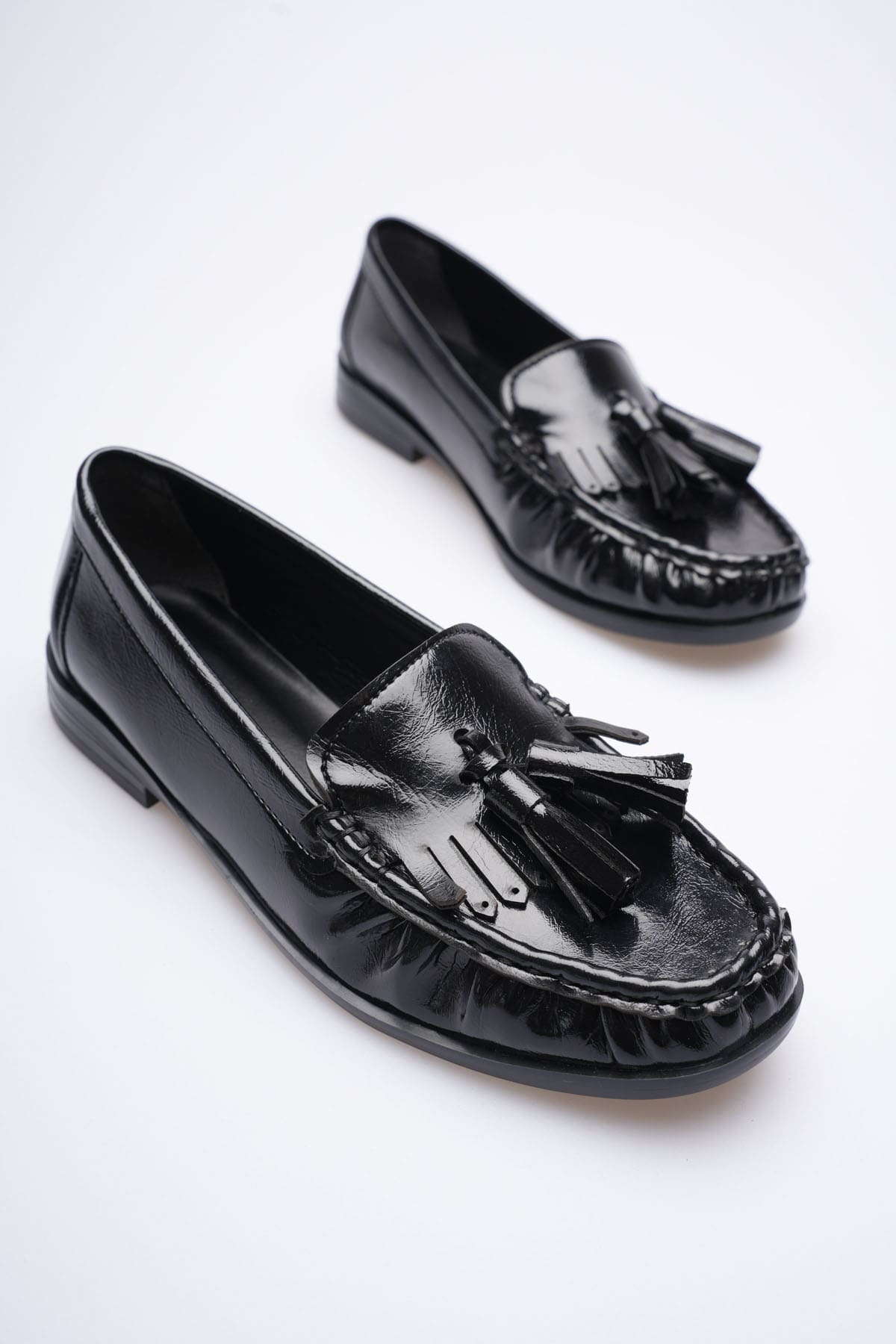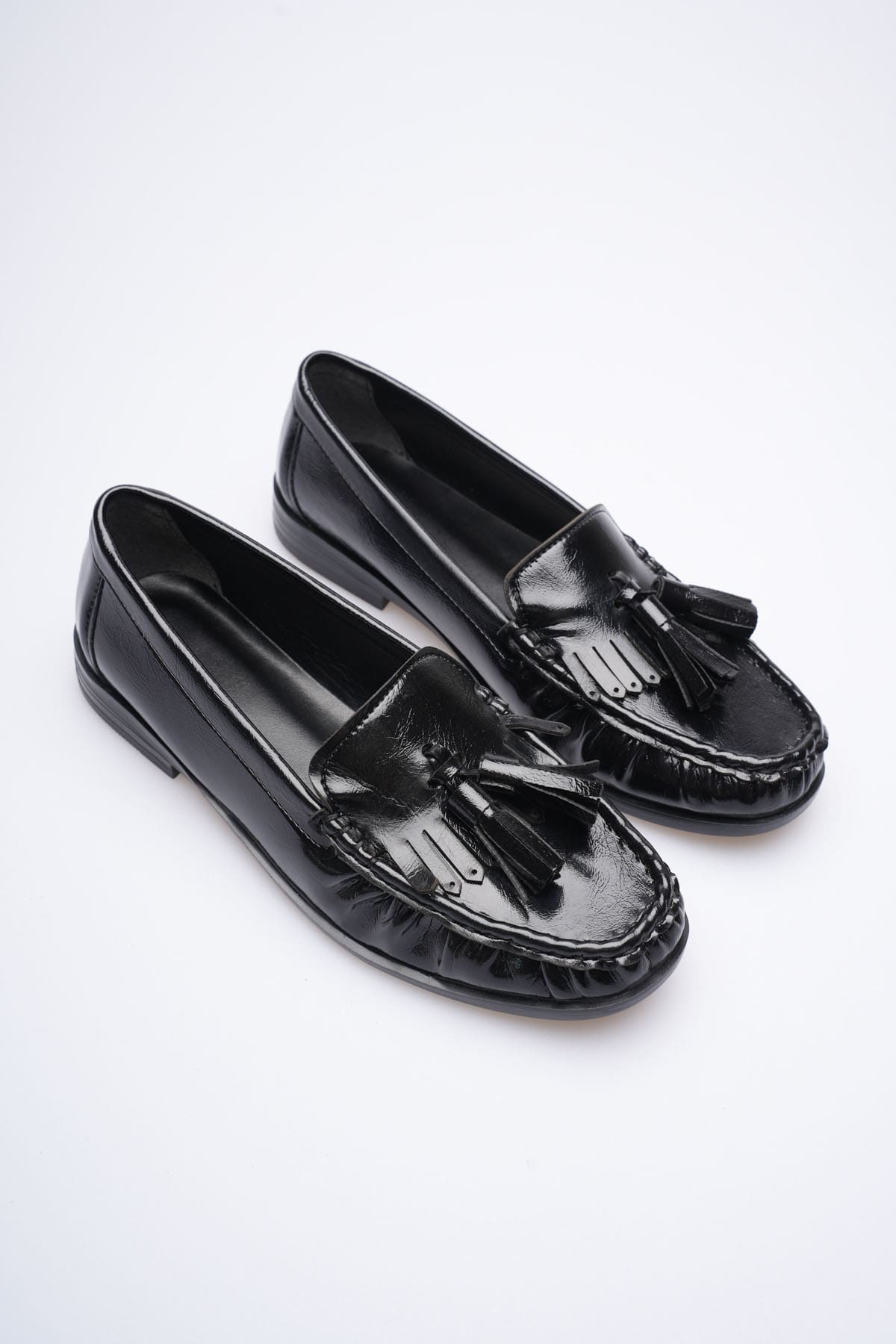 Göz alıcı bir şıklık ve maskülen zarafet bir arada! LUVENTA-S Siyah Rugan Püsküllü Kadın Loafer, aynalı rugan yüzeyi ve hareketli püskül detaylarıyla stilinde fark yaratmak isteyen kadınlar için tasarlandı. TR88LS03 model kodlu bu tasarım, klasik loafer formunu yüksek parlaklıktaki dokusuyla birleştirerek, gündüzden geceye her anınıza eşlik edecek bir joker parça sunuyor.