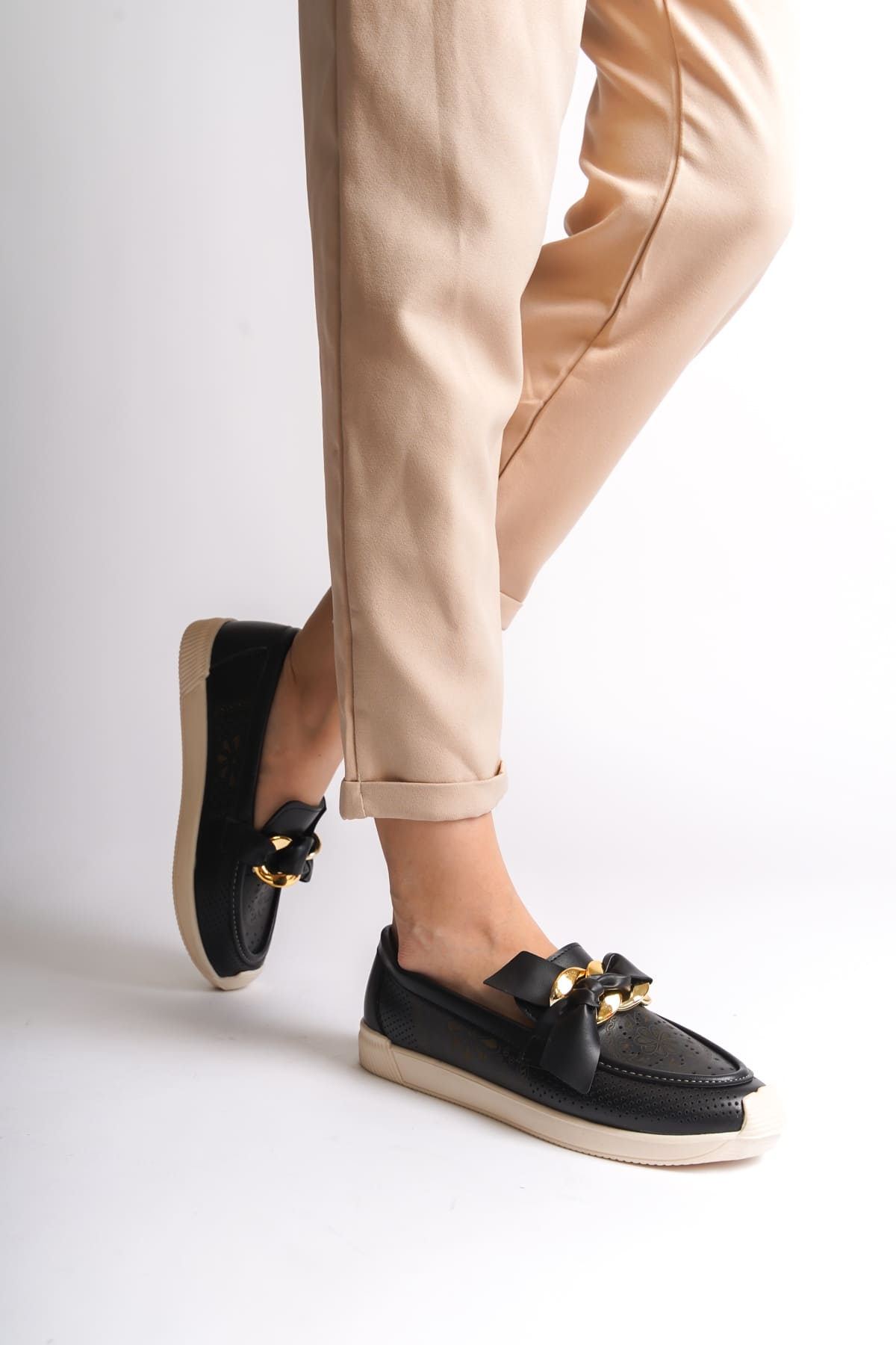 LYDIA Bağcıksız Ortopedik Rahat Taban Çiçek Desenli Babet Ayakkabı KT Siyah