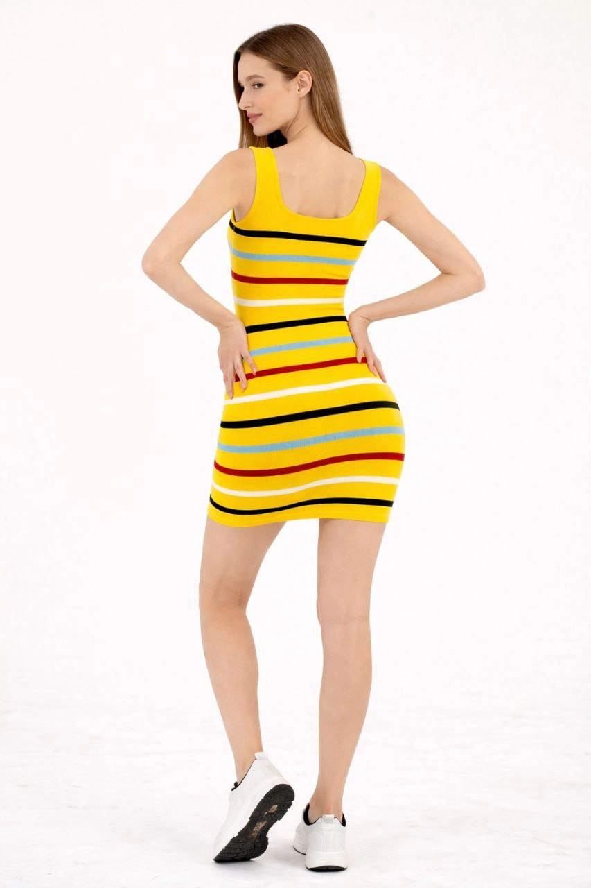 Mivlo Sarı Kadın Kare Yaka Midi Boy Likralı Polelit Elbise