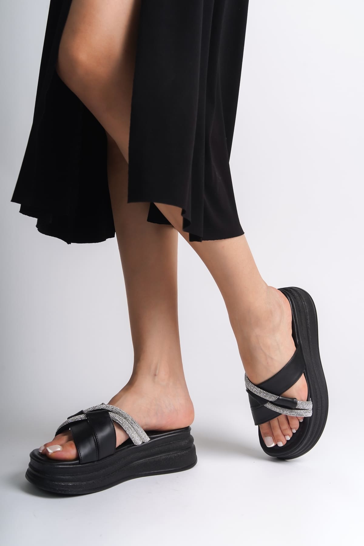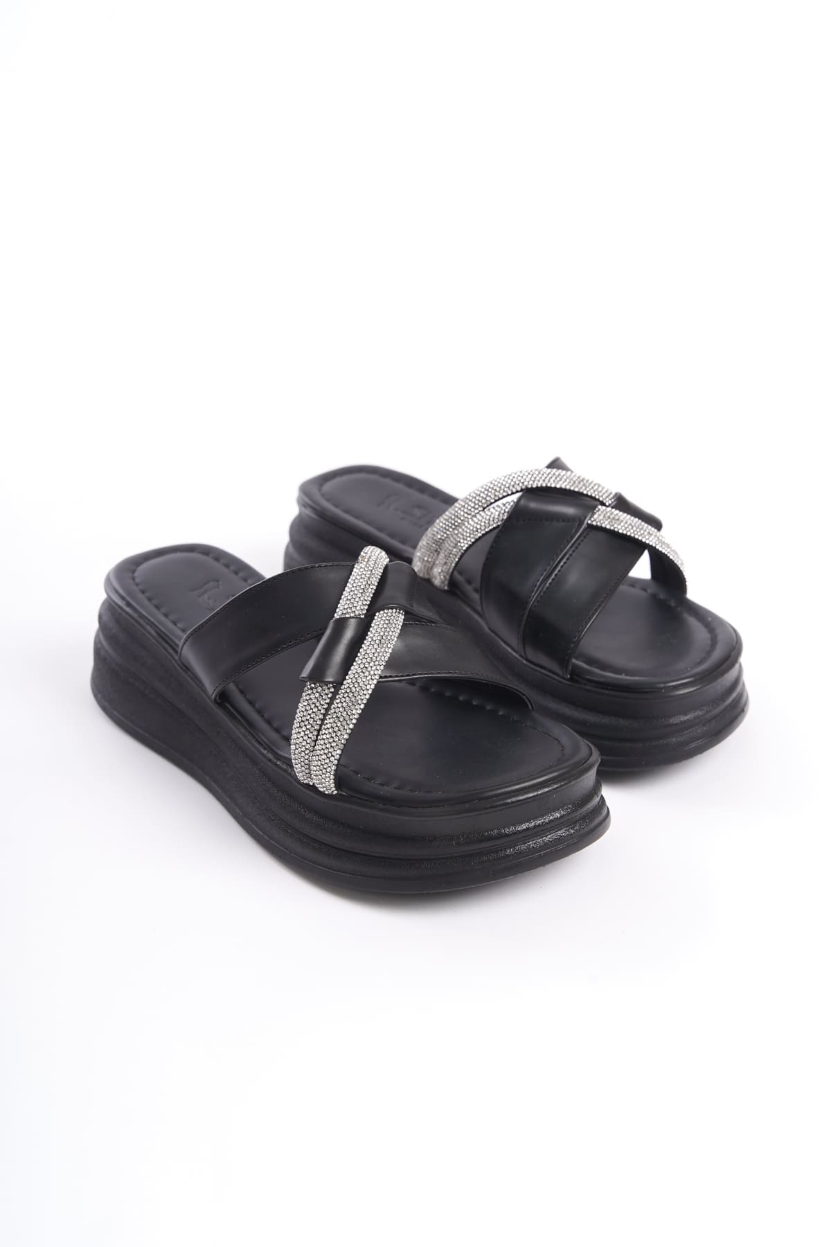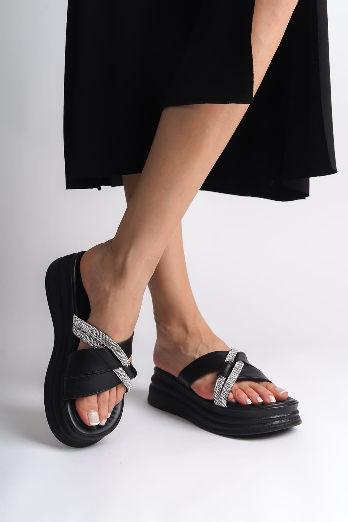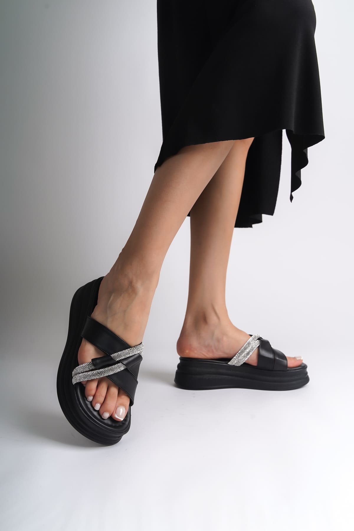 New Ruby Taşlı Şeritli Siyah Kadın Terlik
