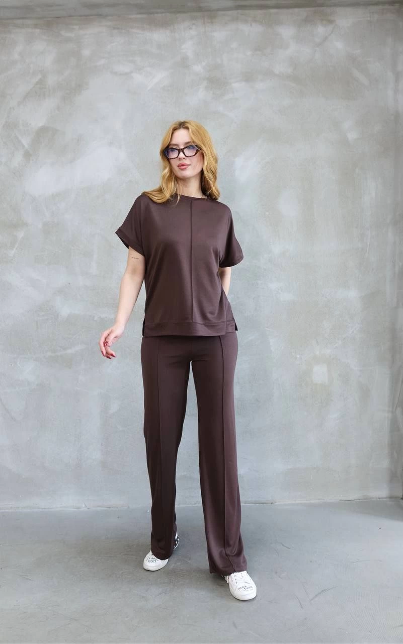 Osy Modal Yumuşak dokulu Kumaş Bisiklet Yaka Kısa Kollu Takım - Kahverengi