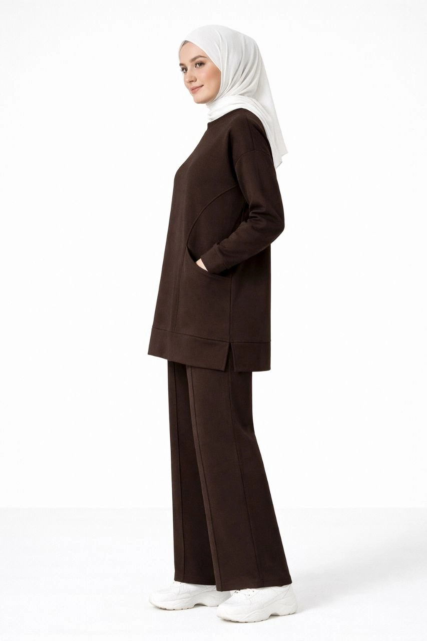 Osy Modal yumuşak dokulu Kumaş Tesettür Cepli Tunik Pantolon Takım - Kahverengi