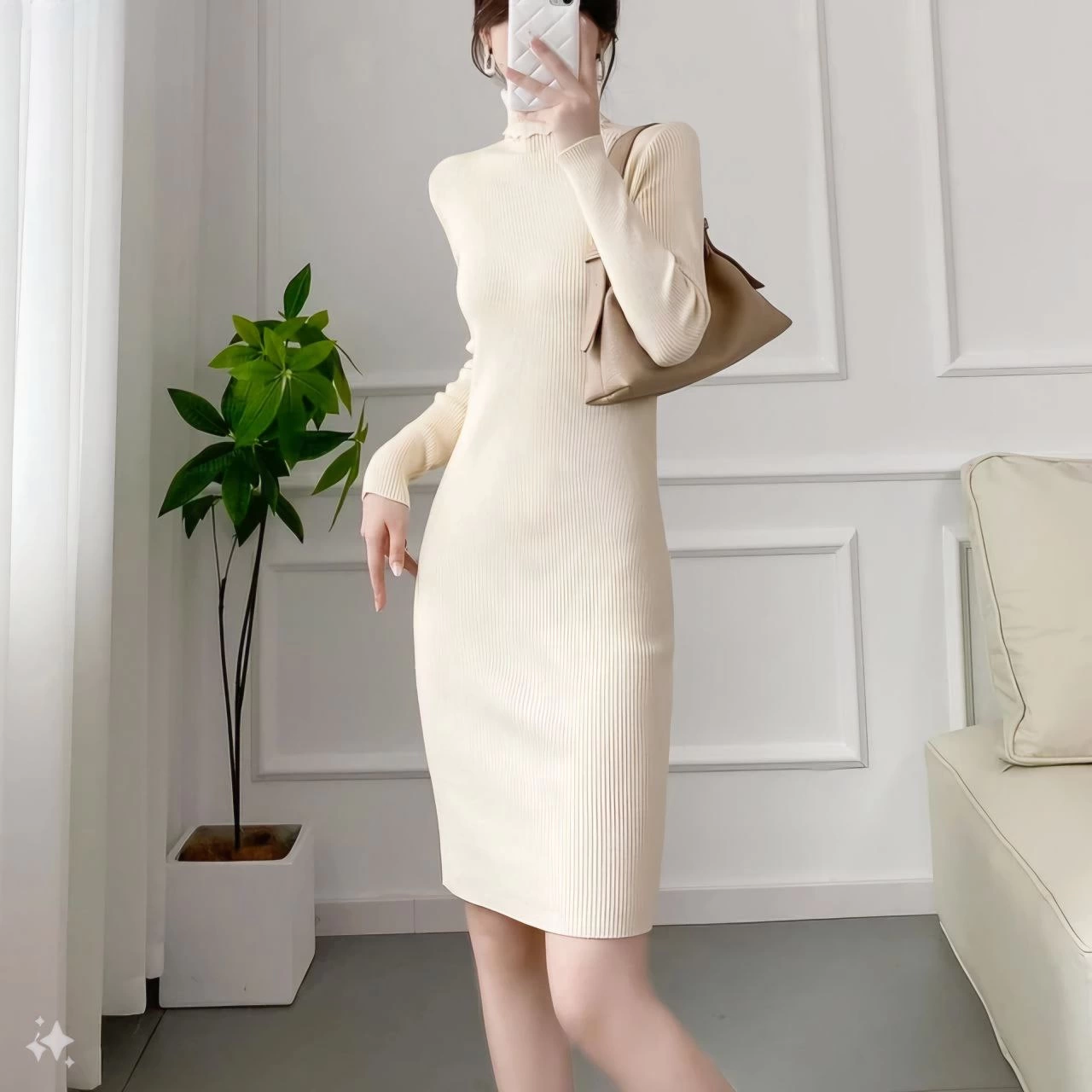 Boğazlı Triko Kadın Elbise - Beyaz -