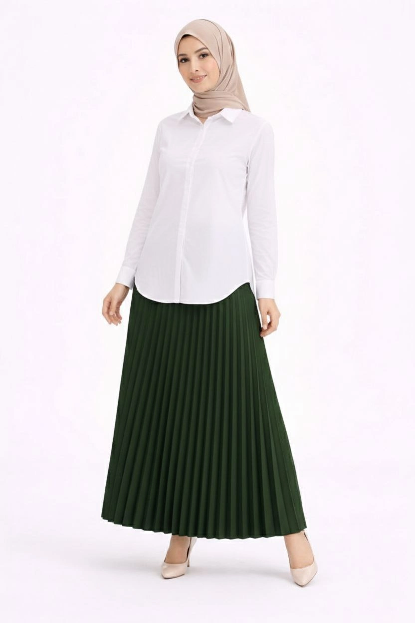 Tesettür Beyaz Gömlekli Pliseli Etek İkili Takım Gündelik ve Ofis Şıklığı - Çağla Yeşili