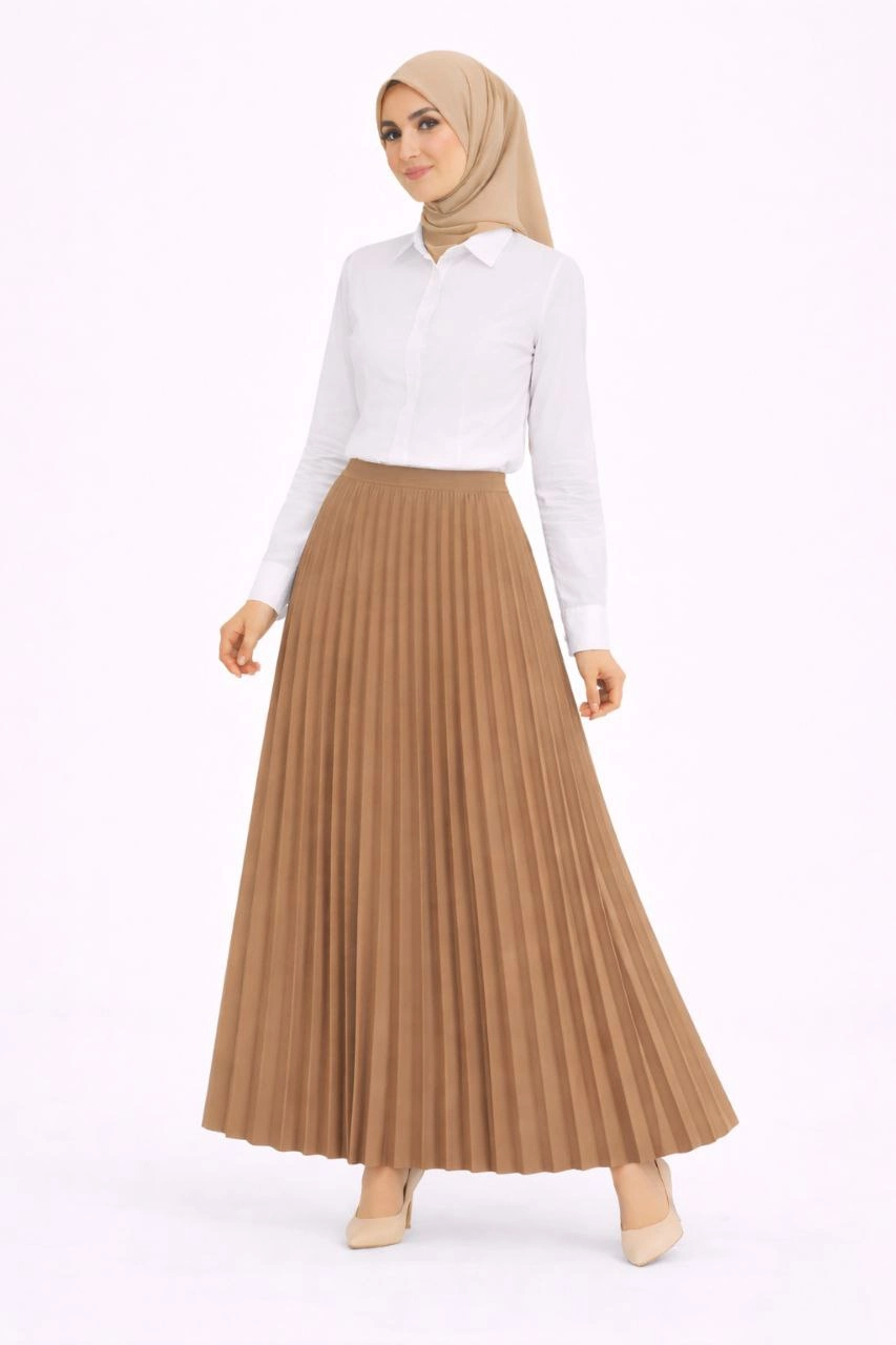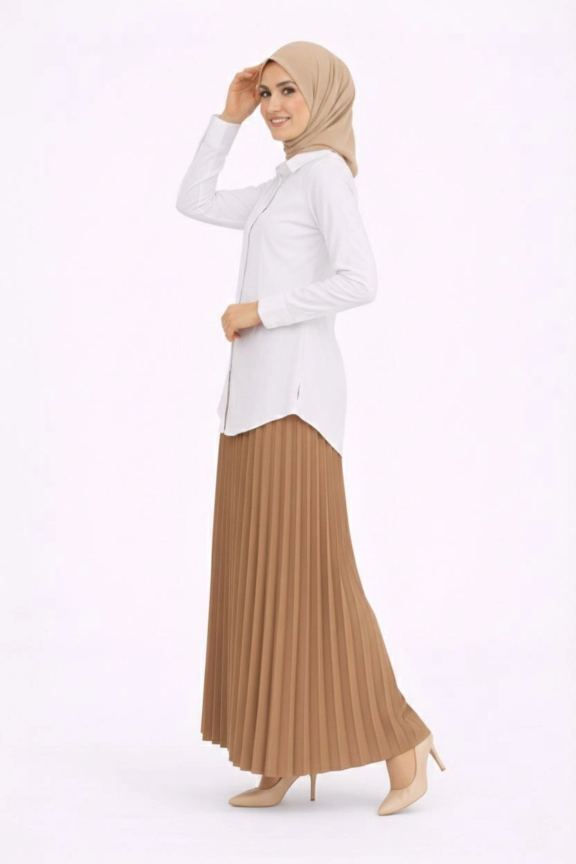 Tesettür Beyaz Gömlekli Pliseli Etek İkili Takım Gündelik ve Ofis Şıklığı - Kahverengi