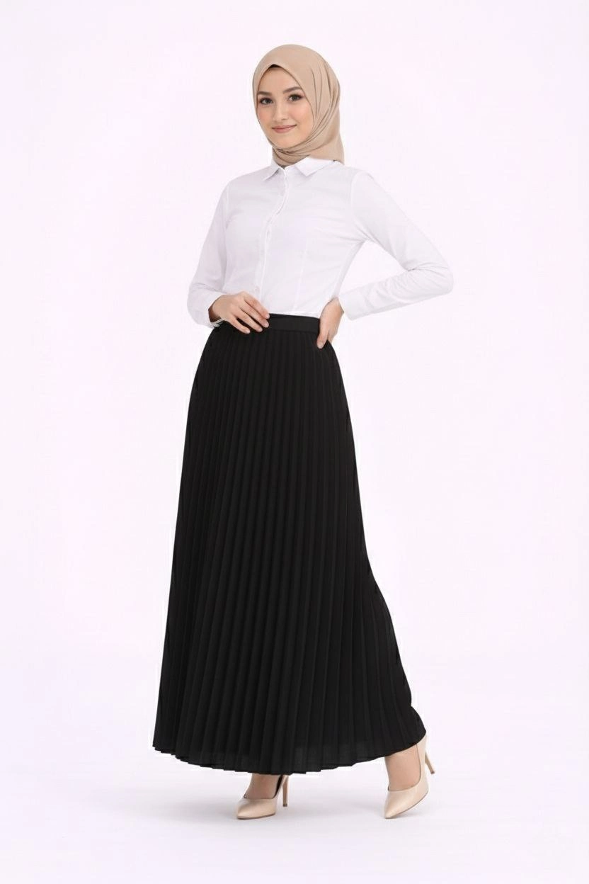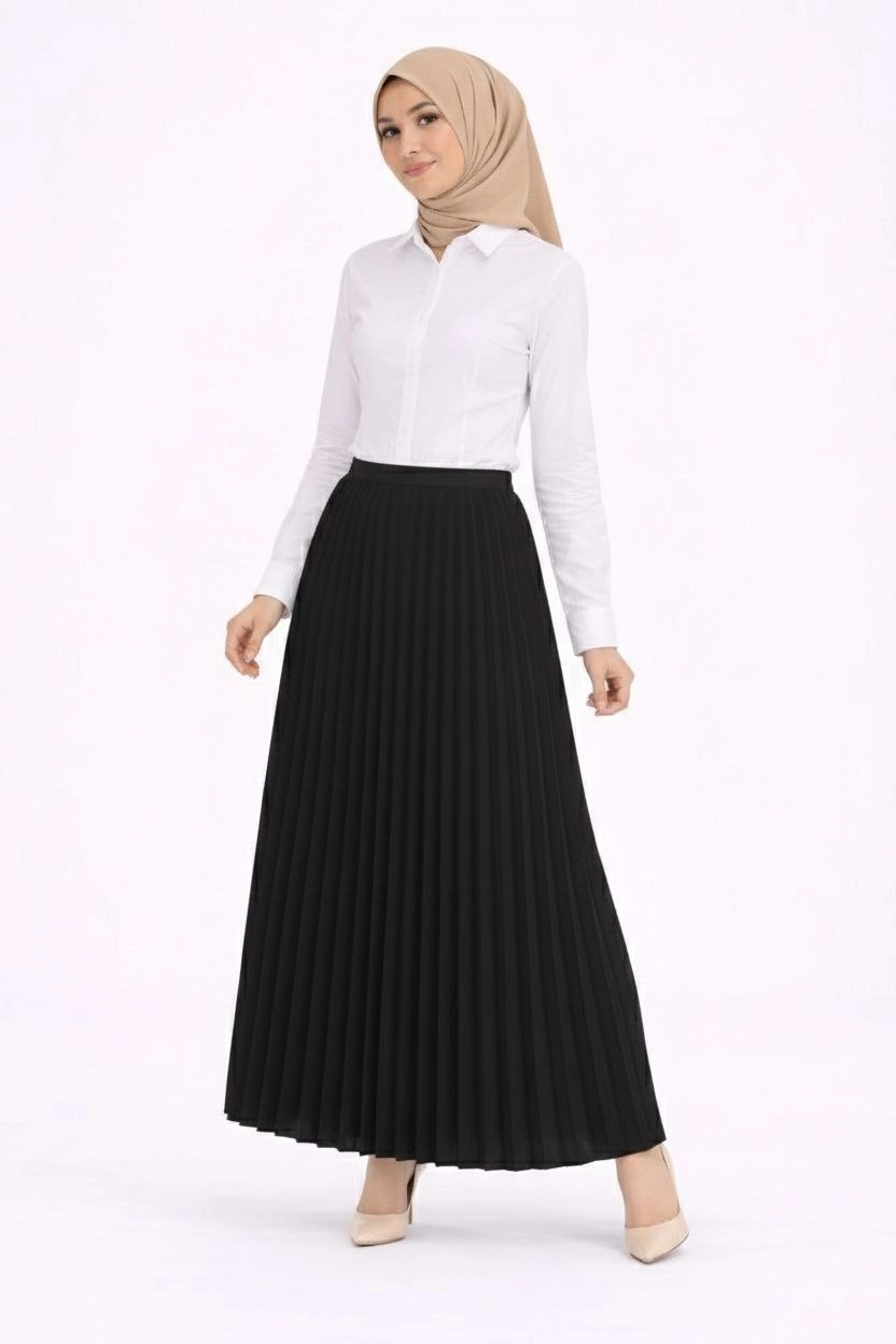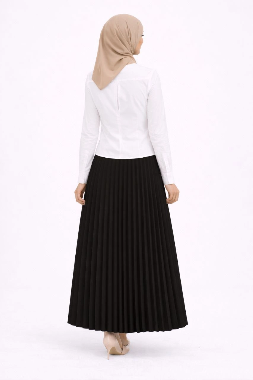 Tesettür Beyaz Gömlekli Pliseli Etek İkili Takım Gündelik ve Ofis Şıklığı - Siyah