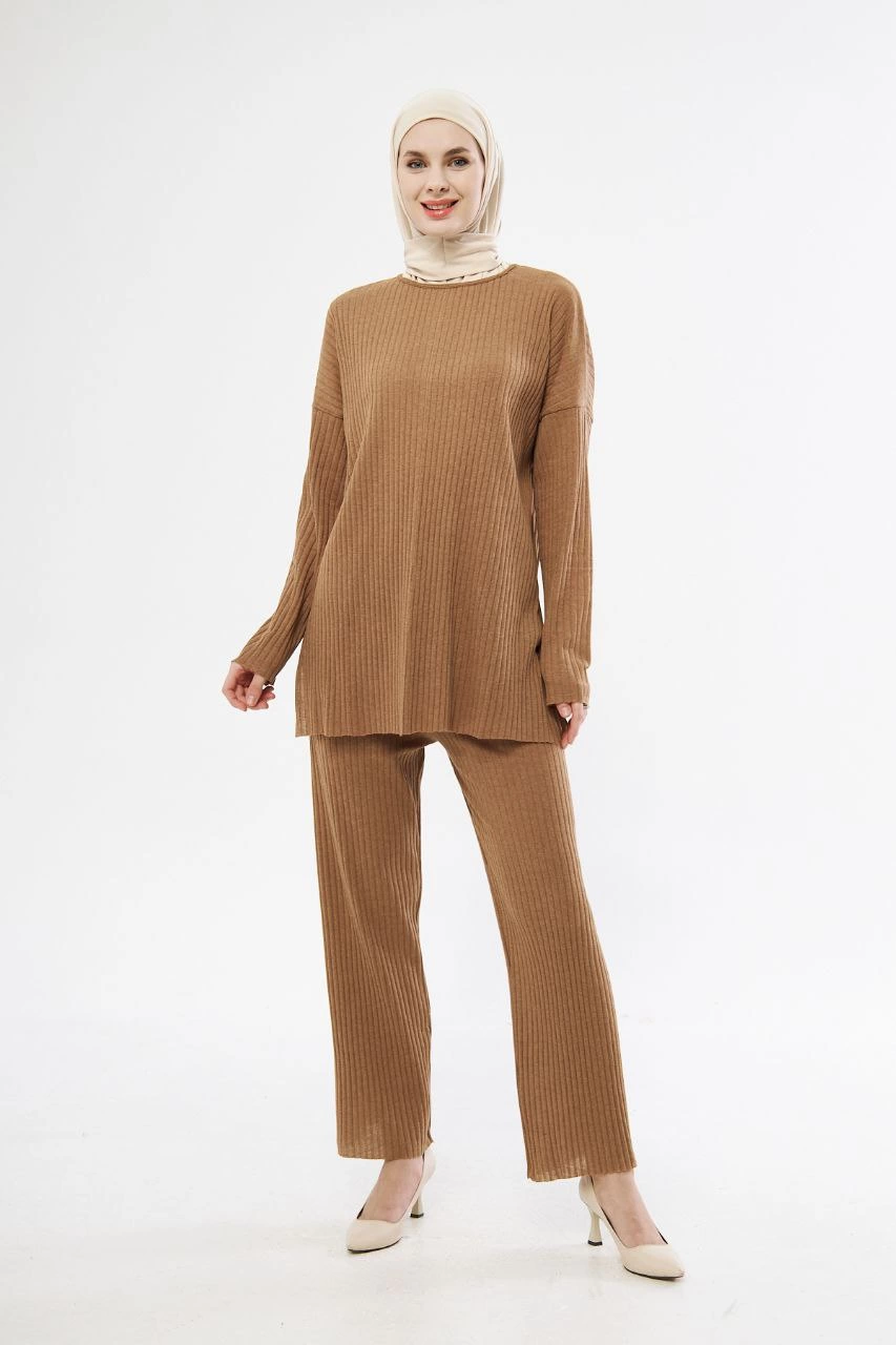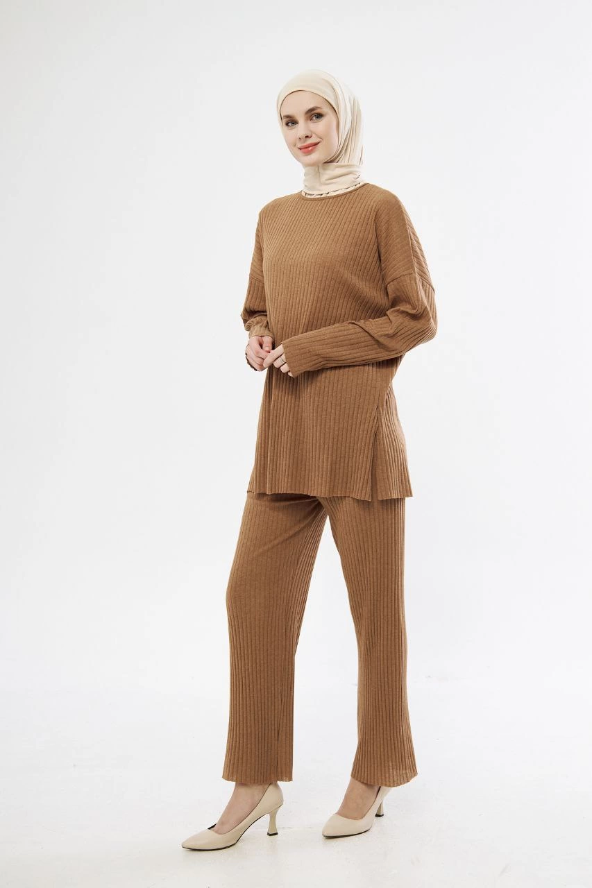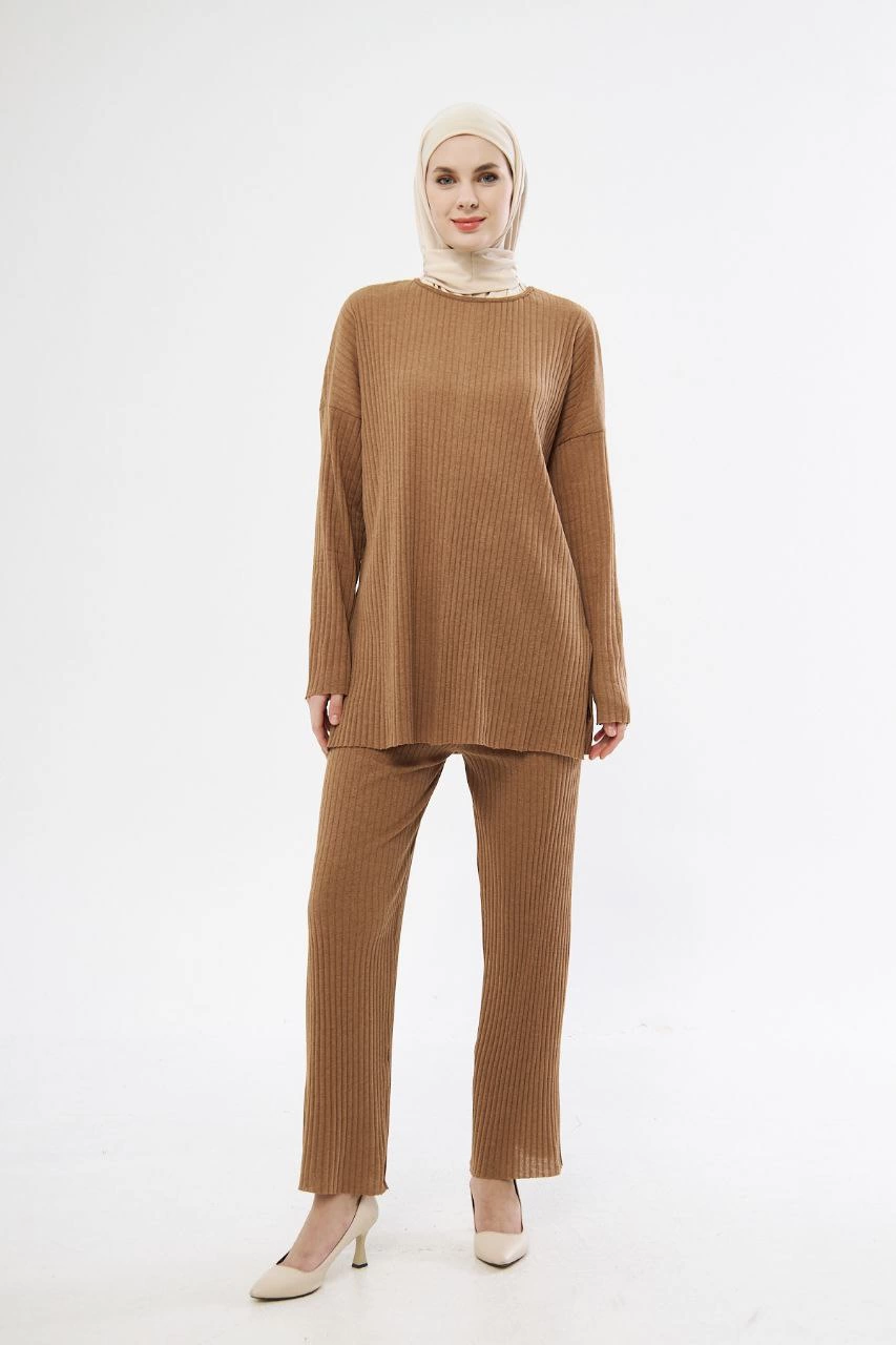 Uzun Kollu Organik Yıkanmış Kumaş Fitilli Pantolonlu Takım - Kahve