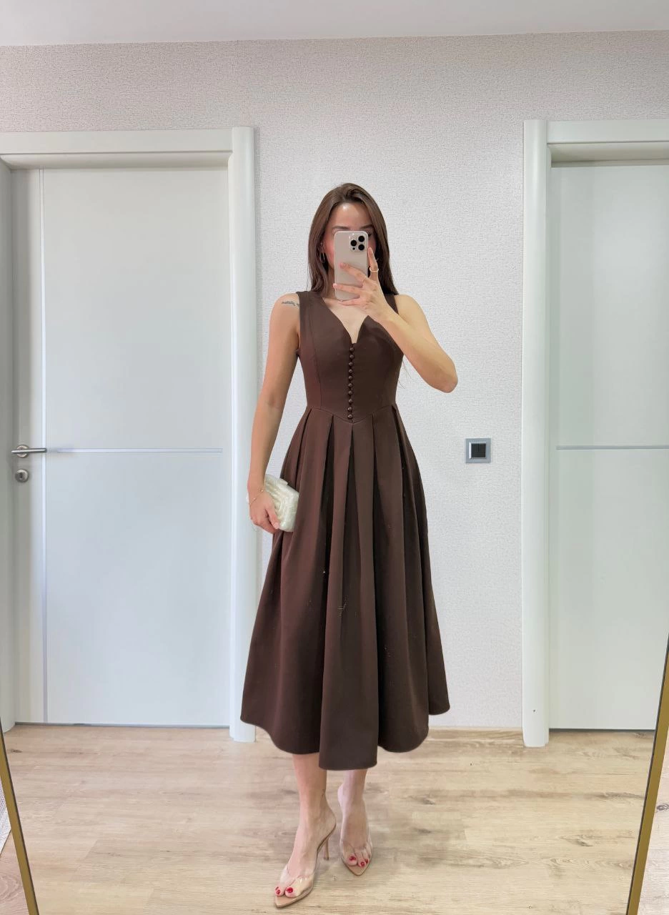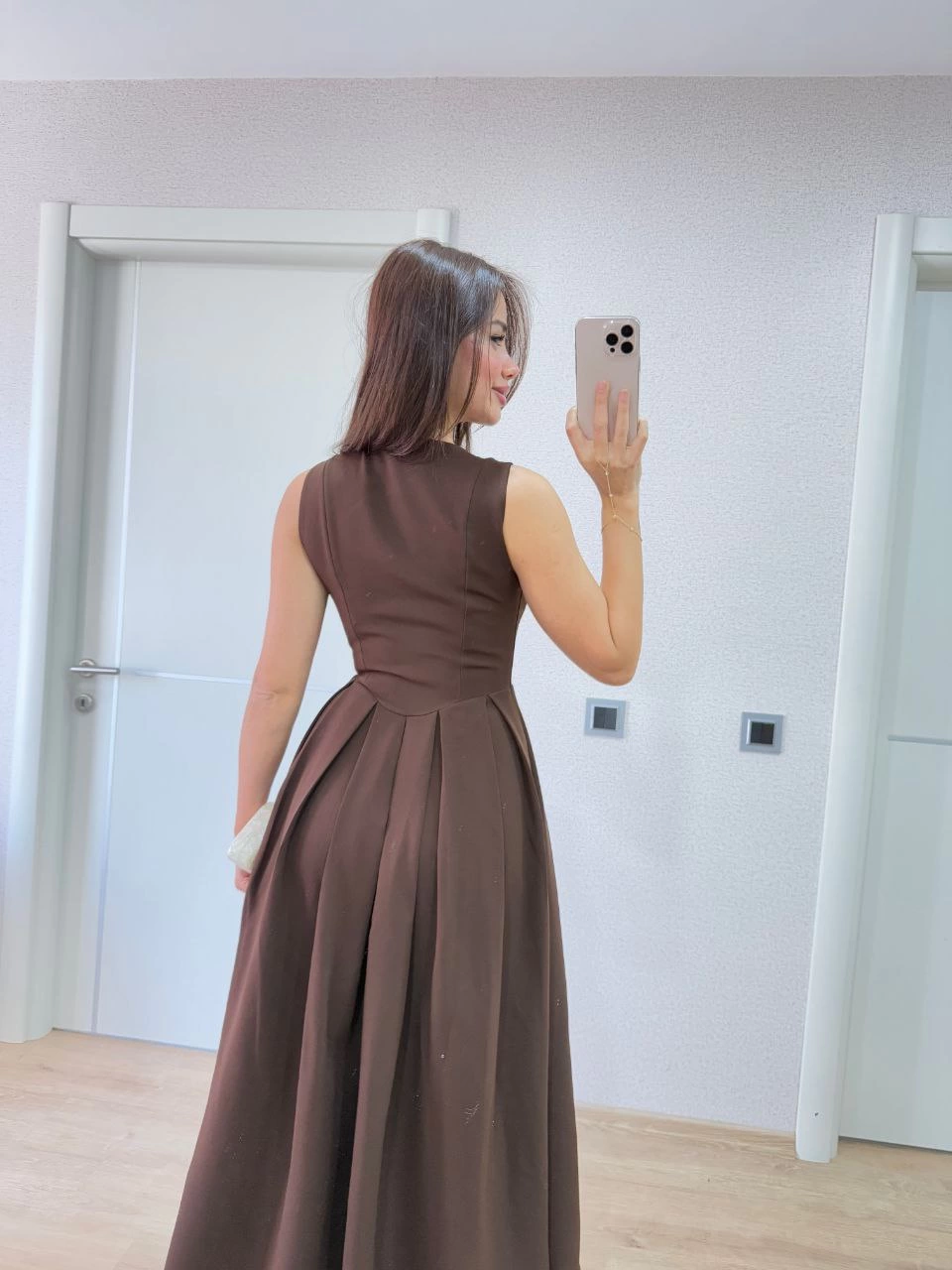 V yaka Krep Arka Ön Pens Detaylı Uzun Kolsuz Elbise- Kahverengi -