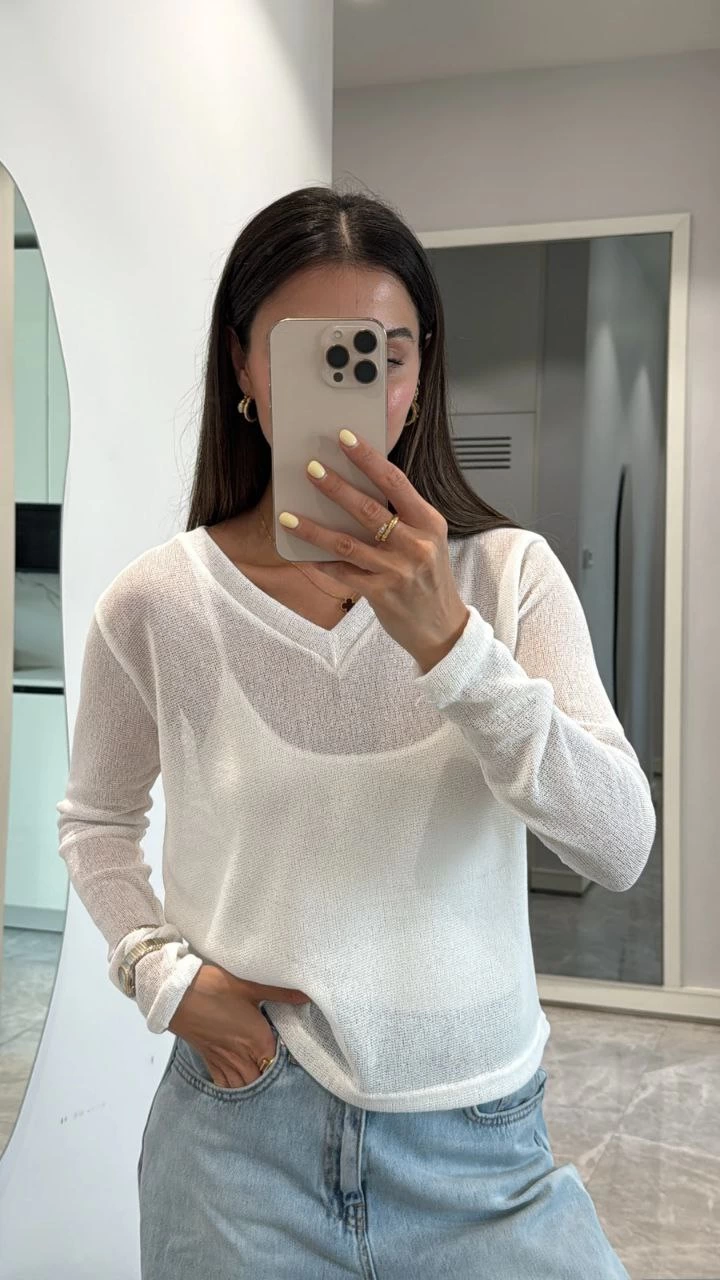 V Yaka uzun Kollu Triko ince Bluz - Beyaz