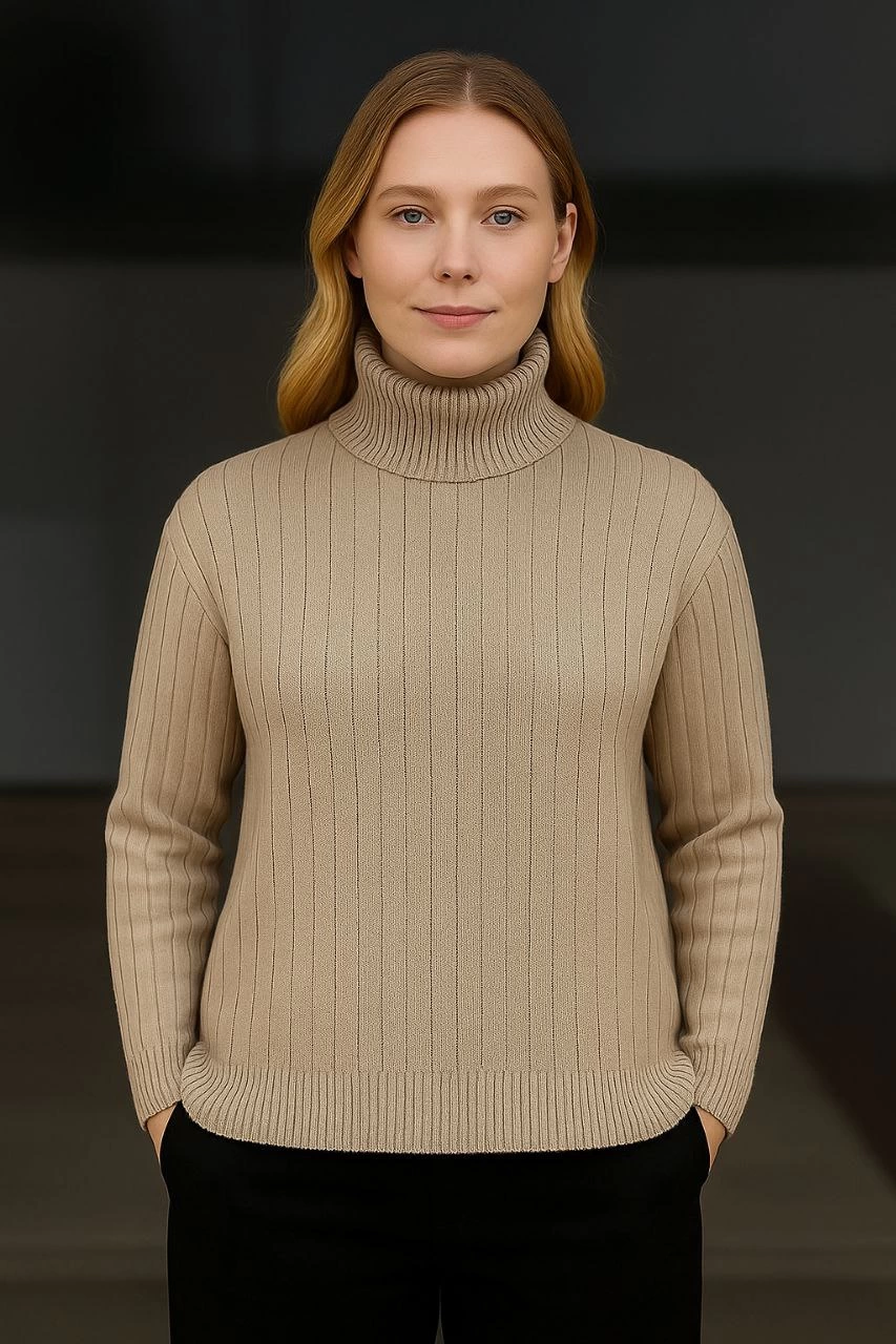 Velmora Balıkcı Yaka Bağazlı Triko Kazak Pamuklu Kalın Fitilli Dokuma - Bej