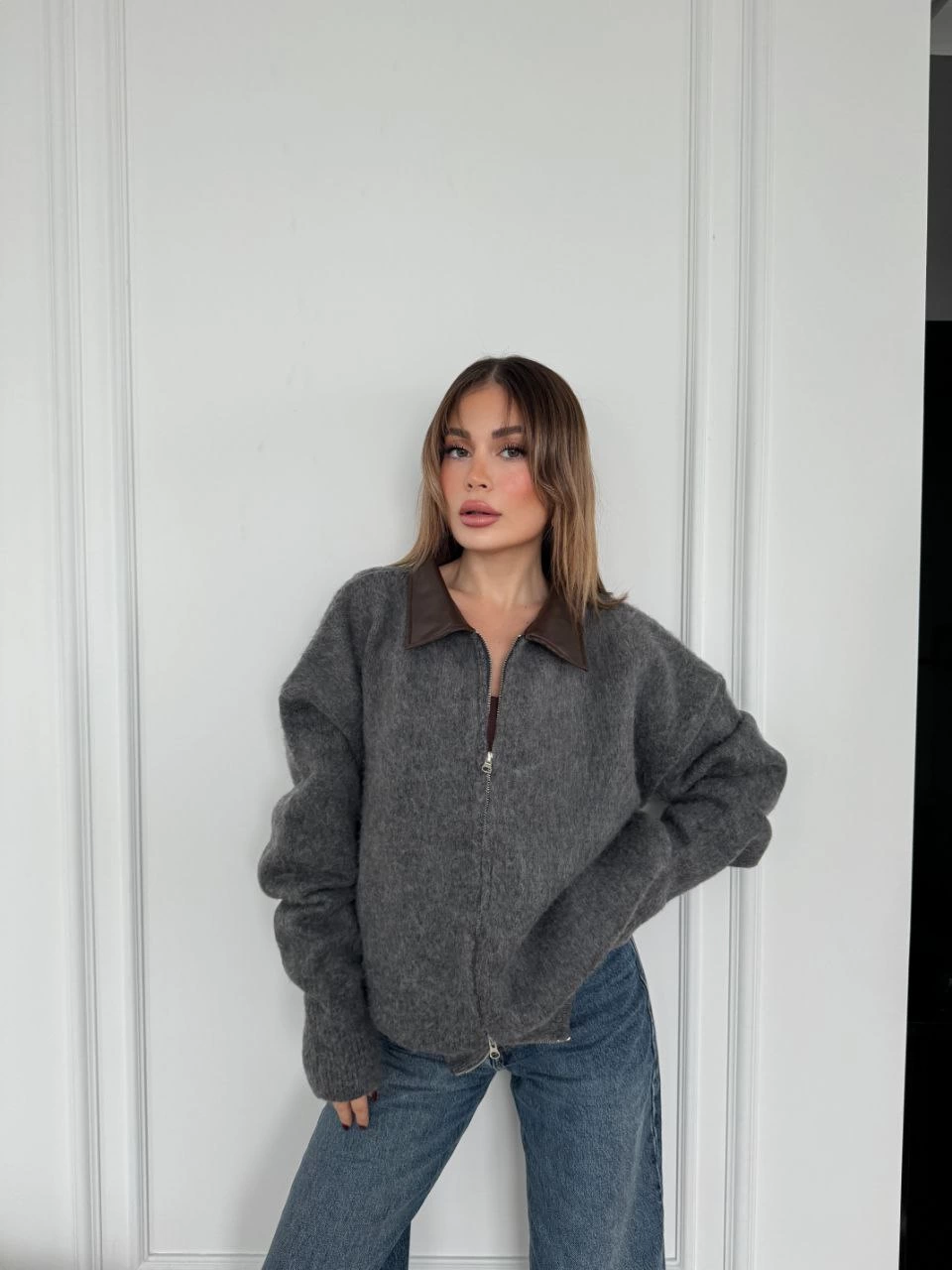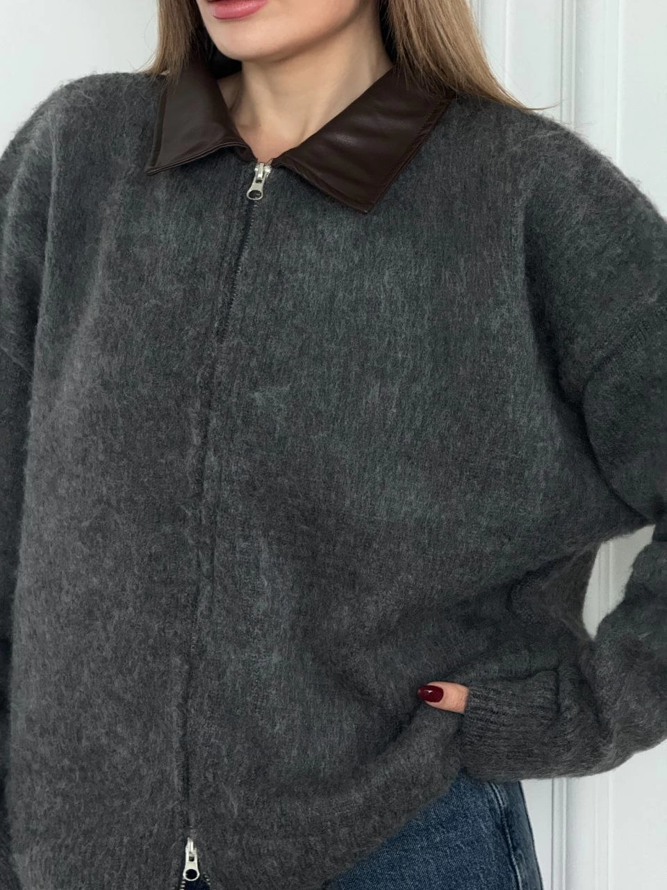 Velmora Deri Yakalı Pamuk dokulu Çift Taraflı Çalışan Fermuar Ceket - Füme -