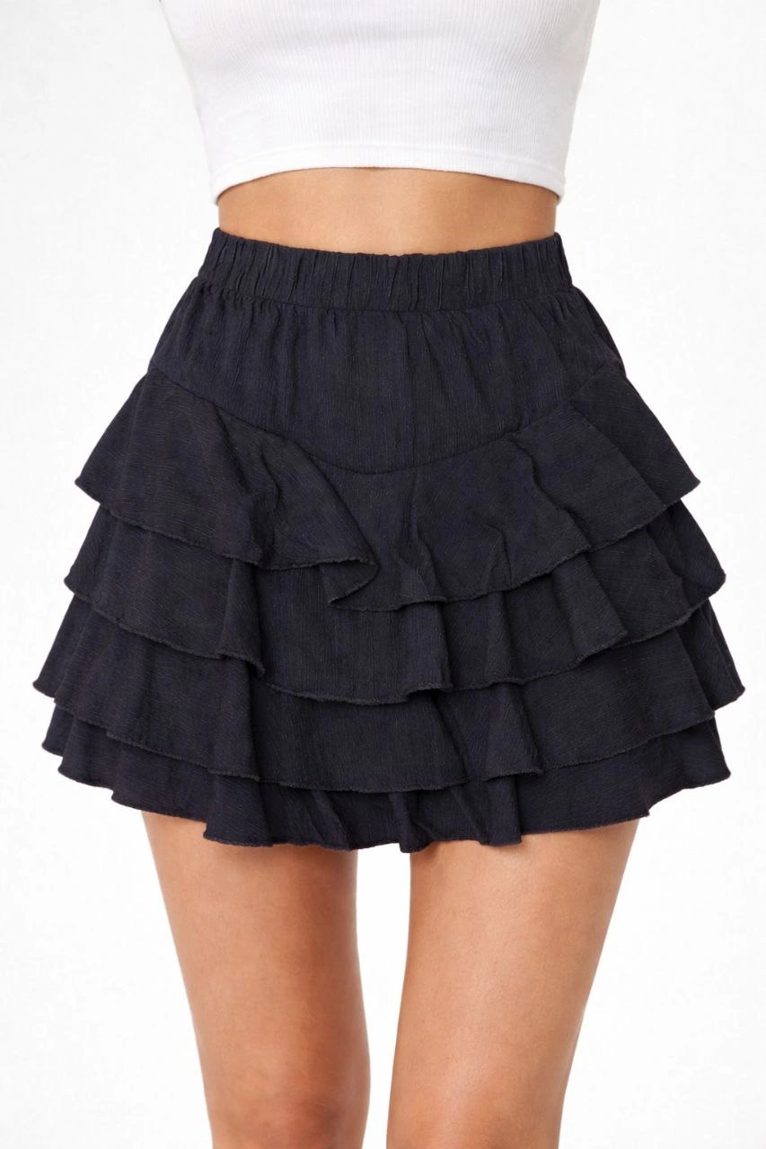 Velmora Premium Siyah Katlı Mini Fırfıtlı Etek Lastikli Yüksel Bel, Volanlı Tasarım, Rahat Kalıp, Günlük ve Şık Kombinelere Uygun Yazlık Etek - Siyah