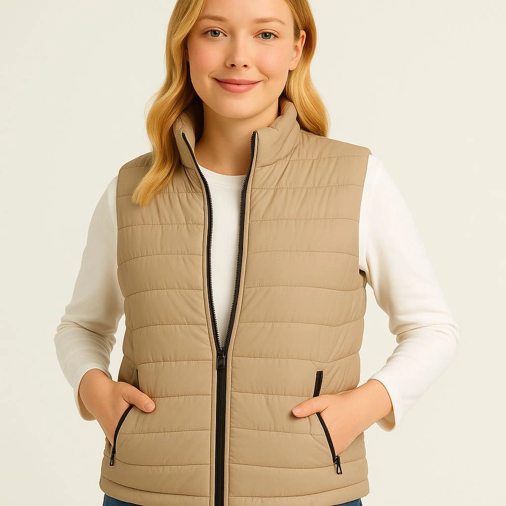 Velmora Şişme Fermuarlı Yelek Su itici Kapitone Astarlı Kumaş Cepli Hafif Kışlık Spor Rahat Kalıp - Bej